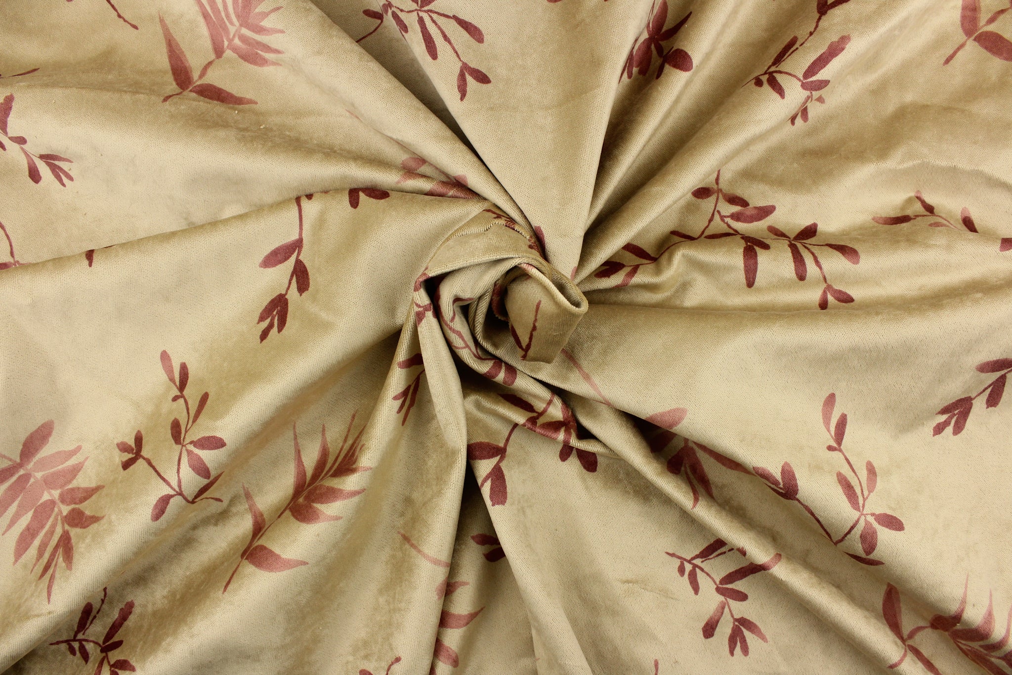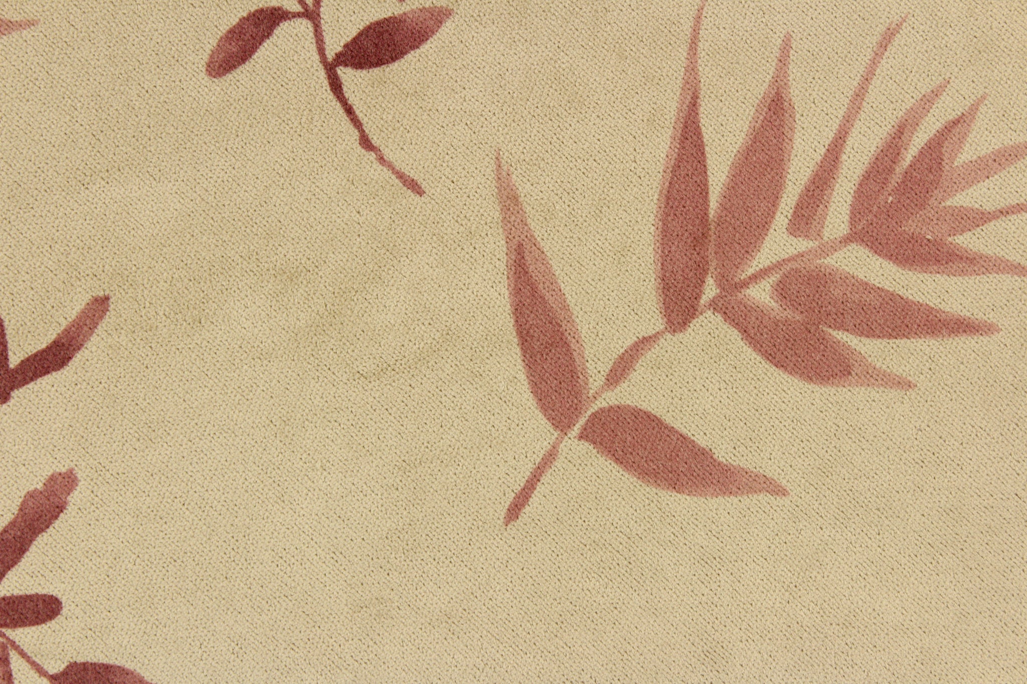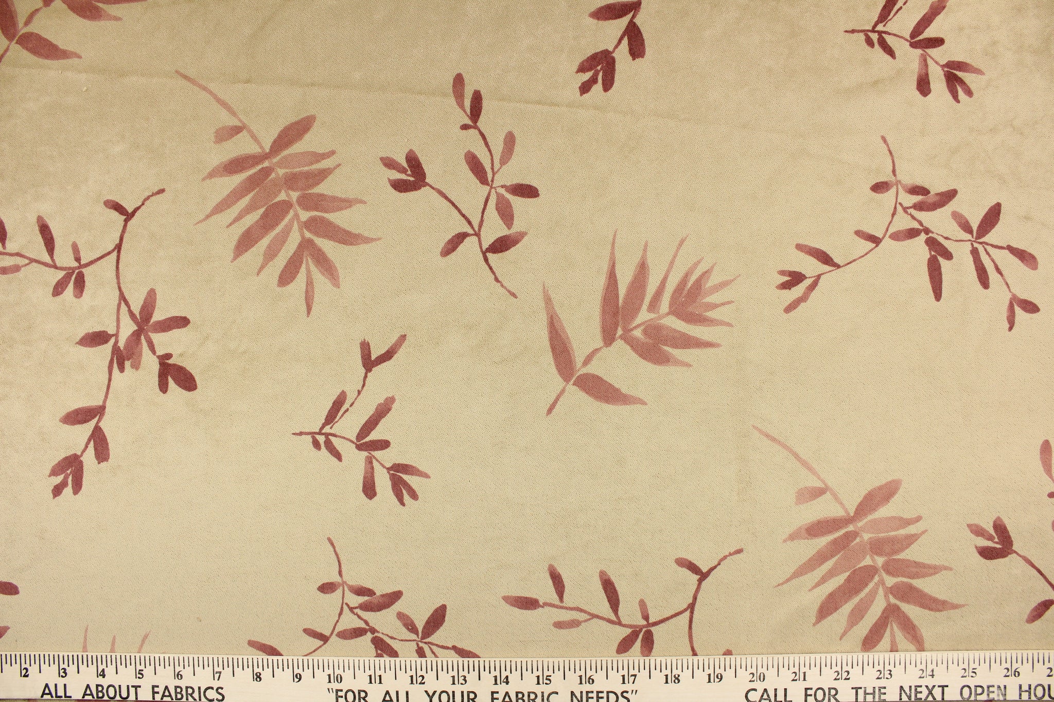 DESCRIPTION: This velvet features a leaf design in mauve, and maroon against a pale beige . Use this for upholstery, drapery, pillows, etc. This velvet will add sophistication and luxury to any project. The opulent sheen, rich color makes it perfect for all home décor style. We have a wide array of upholstery velvets.