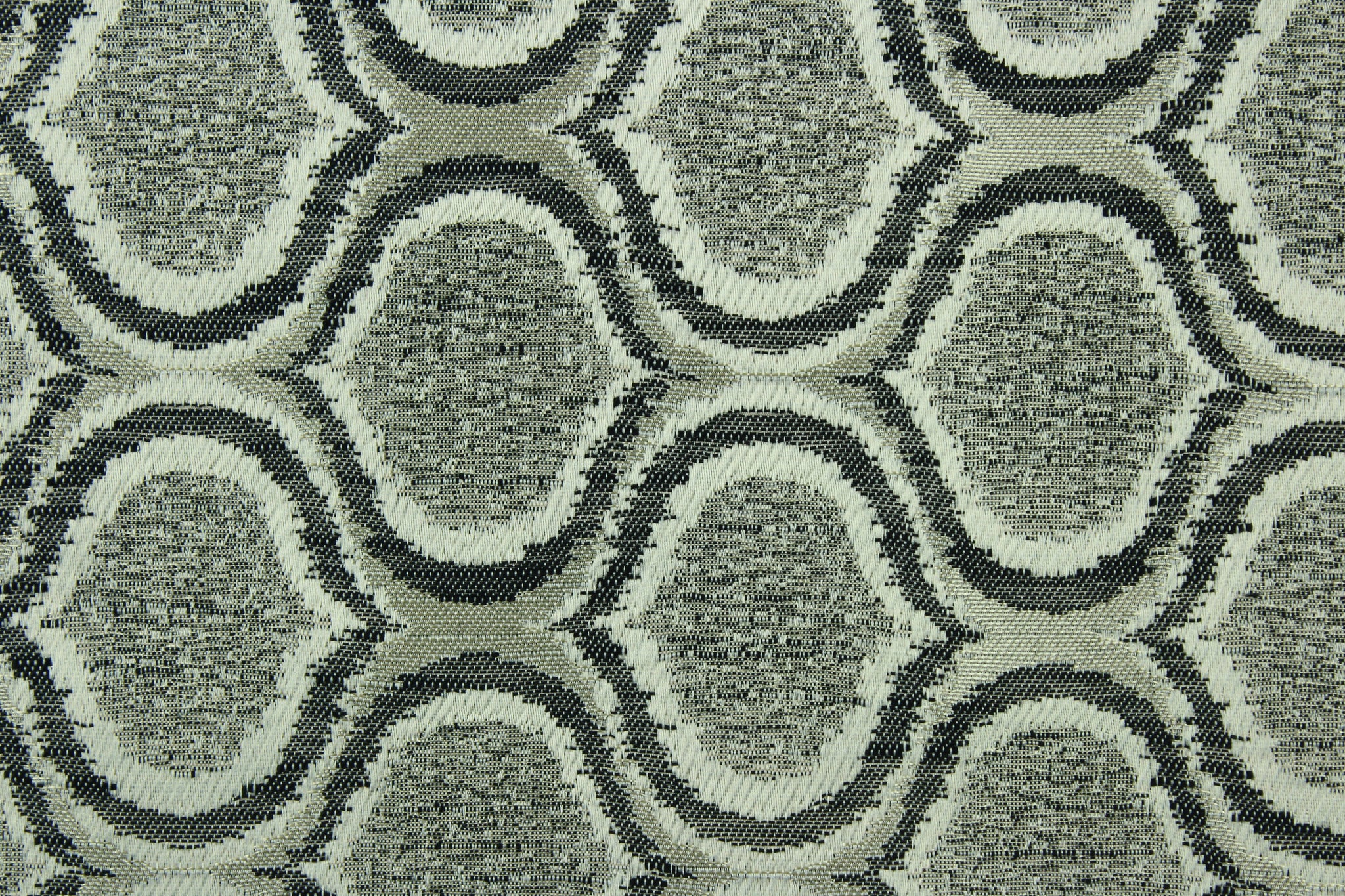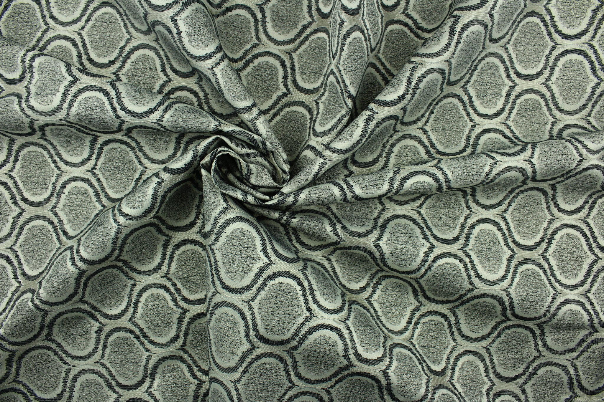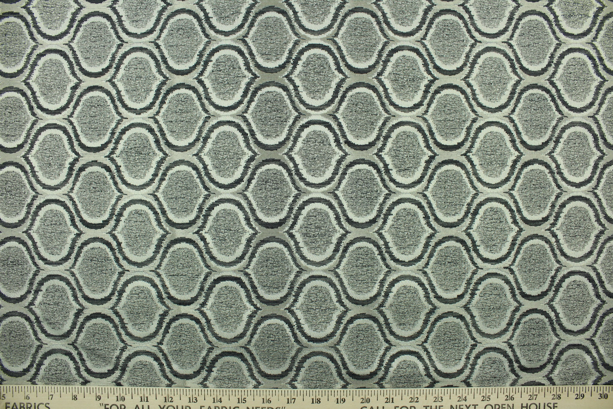 PATTERN DESCRIPTION: This fabric features a geometric design in silver, gray, black, and white with a latex backing. Use this for upholstery, drapery, pillows, and bedding.