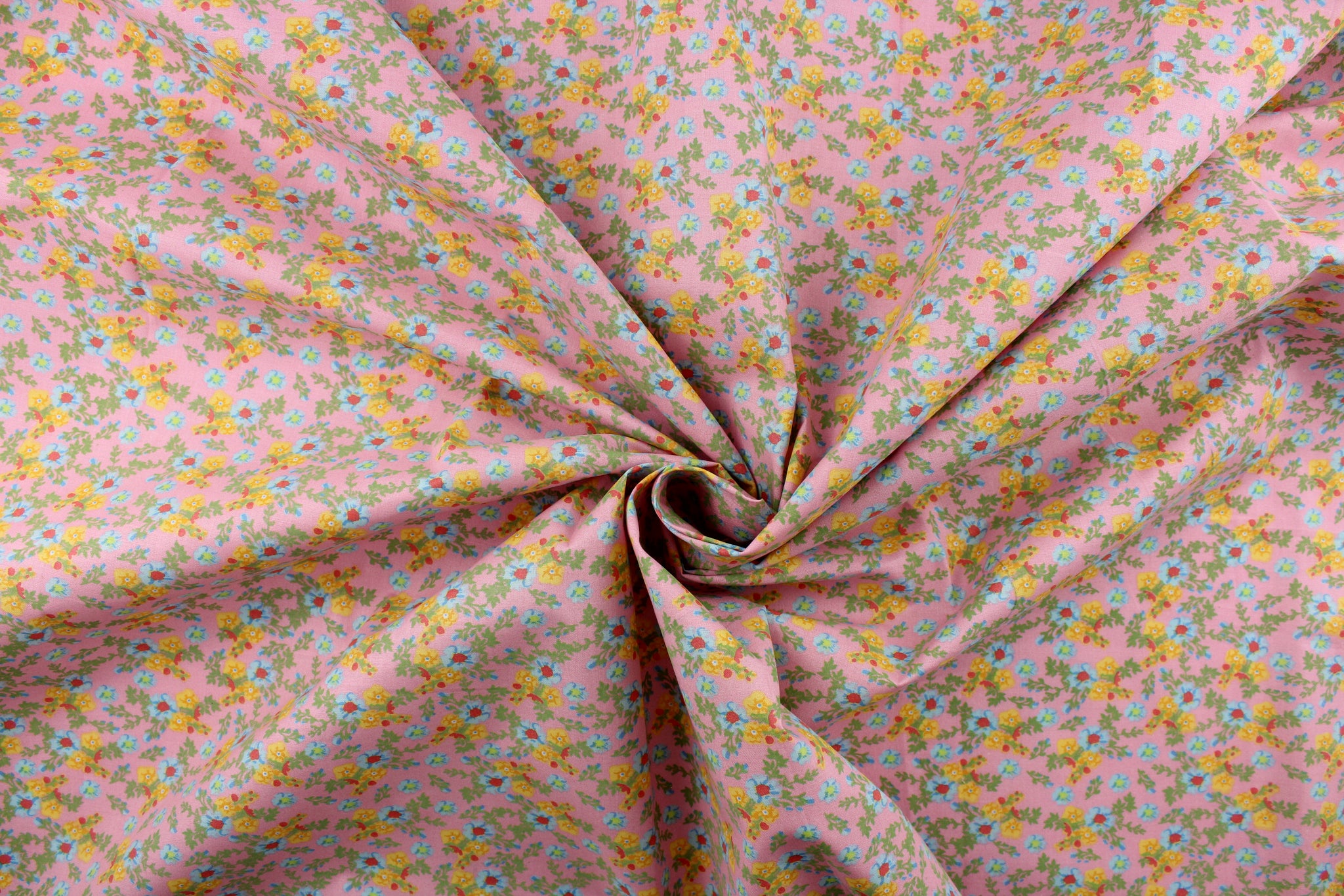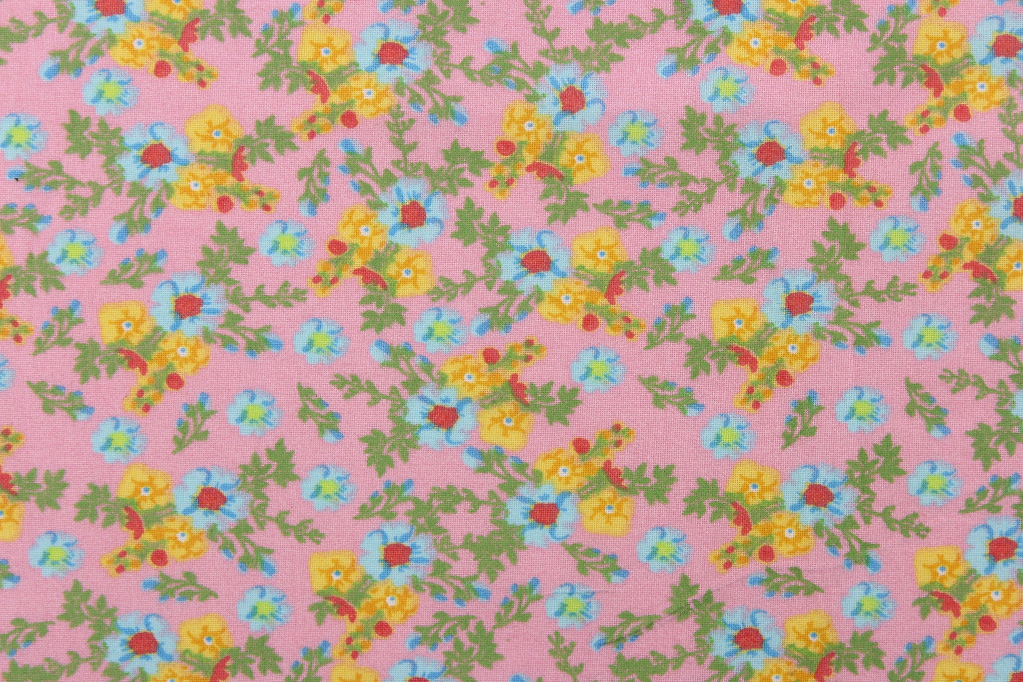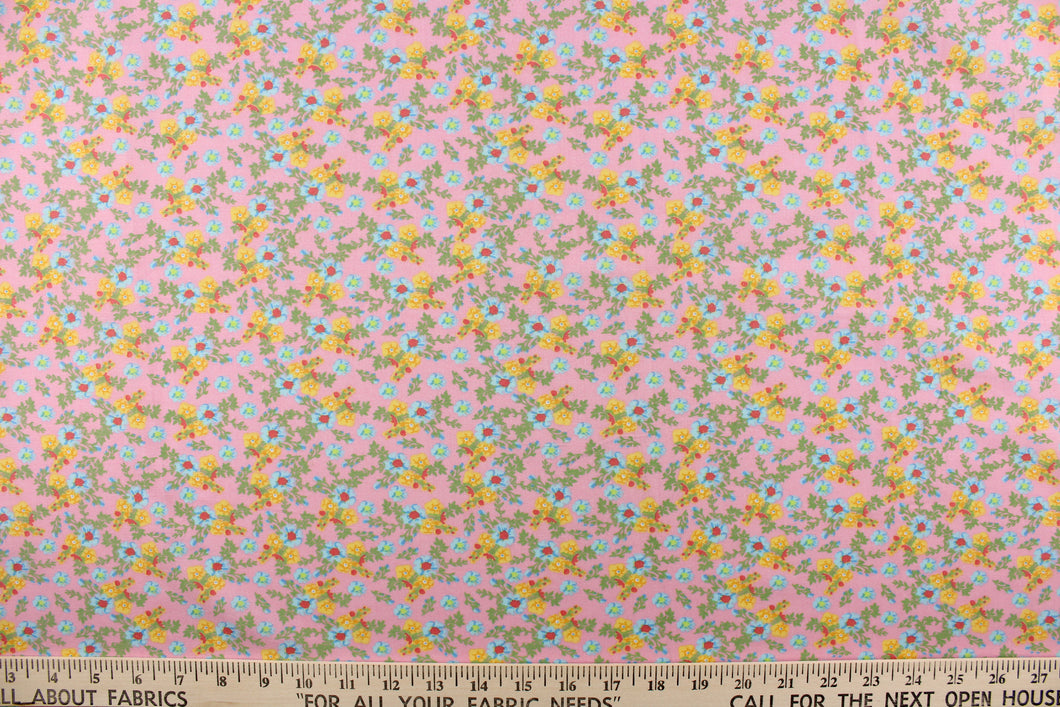 DESCRIPTION: This soft quilting print features a beautiful floral design in blue, yellow, red, and green against a pink background.  Use this for quilting, crafting, apparel and home décor.  We offer this design in several different colors.