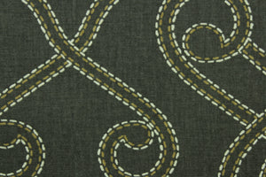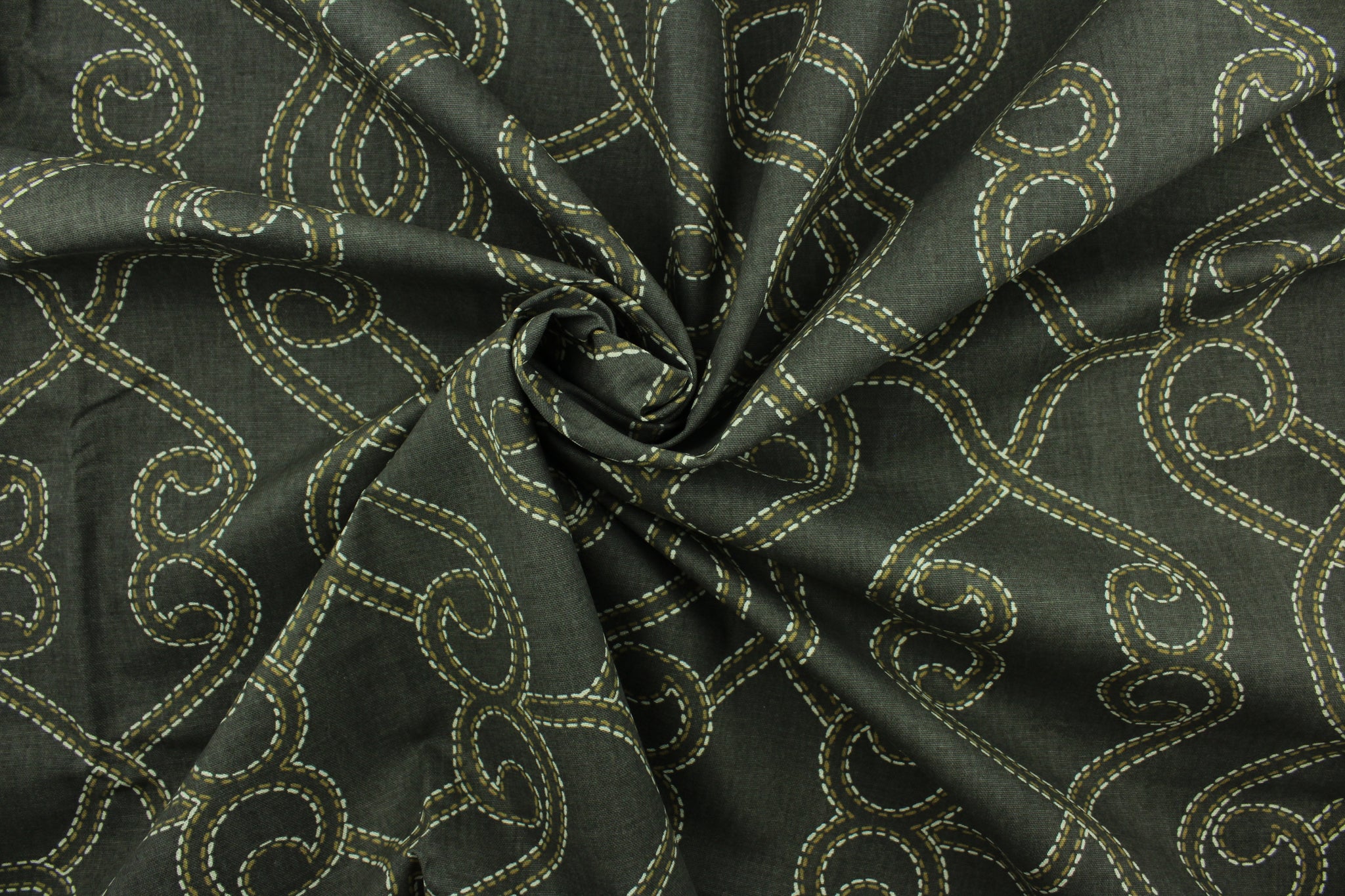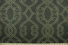 DESCRPTION: This fabric features a geometric design in tan, and off white set against a dark gray brown tone . Use this for upholstery, bedding, pillows, drapery, etc.