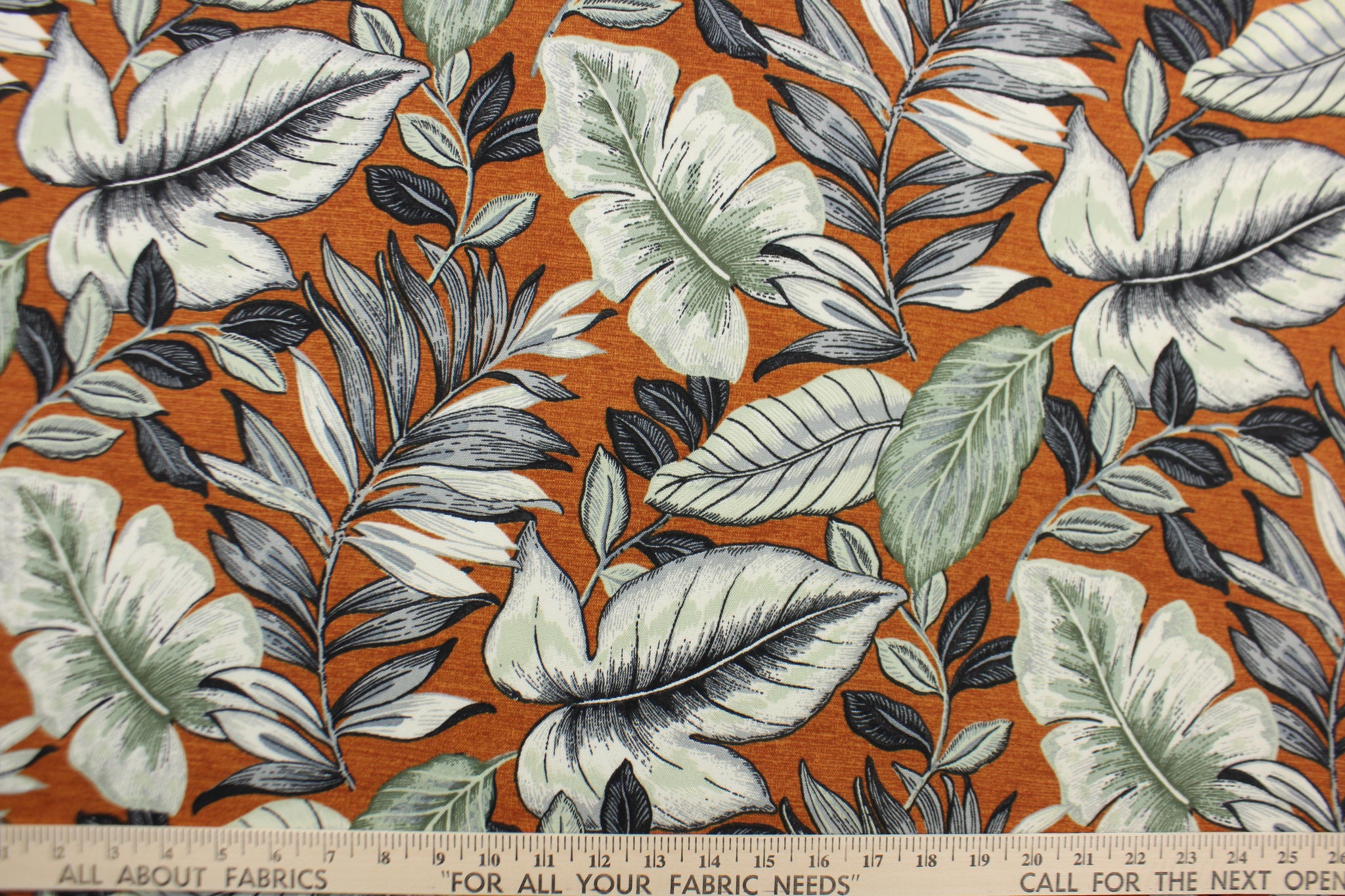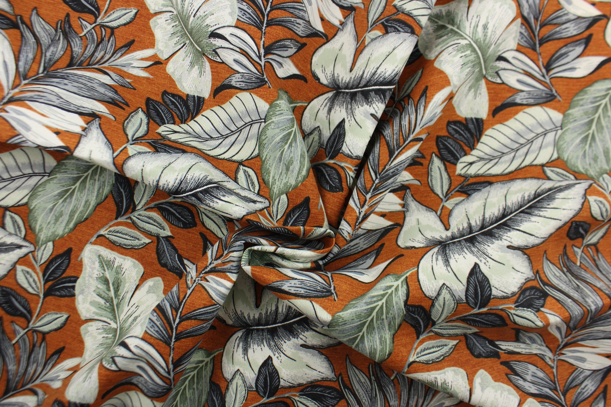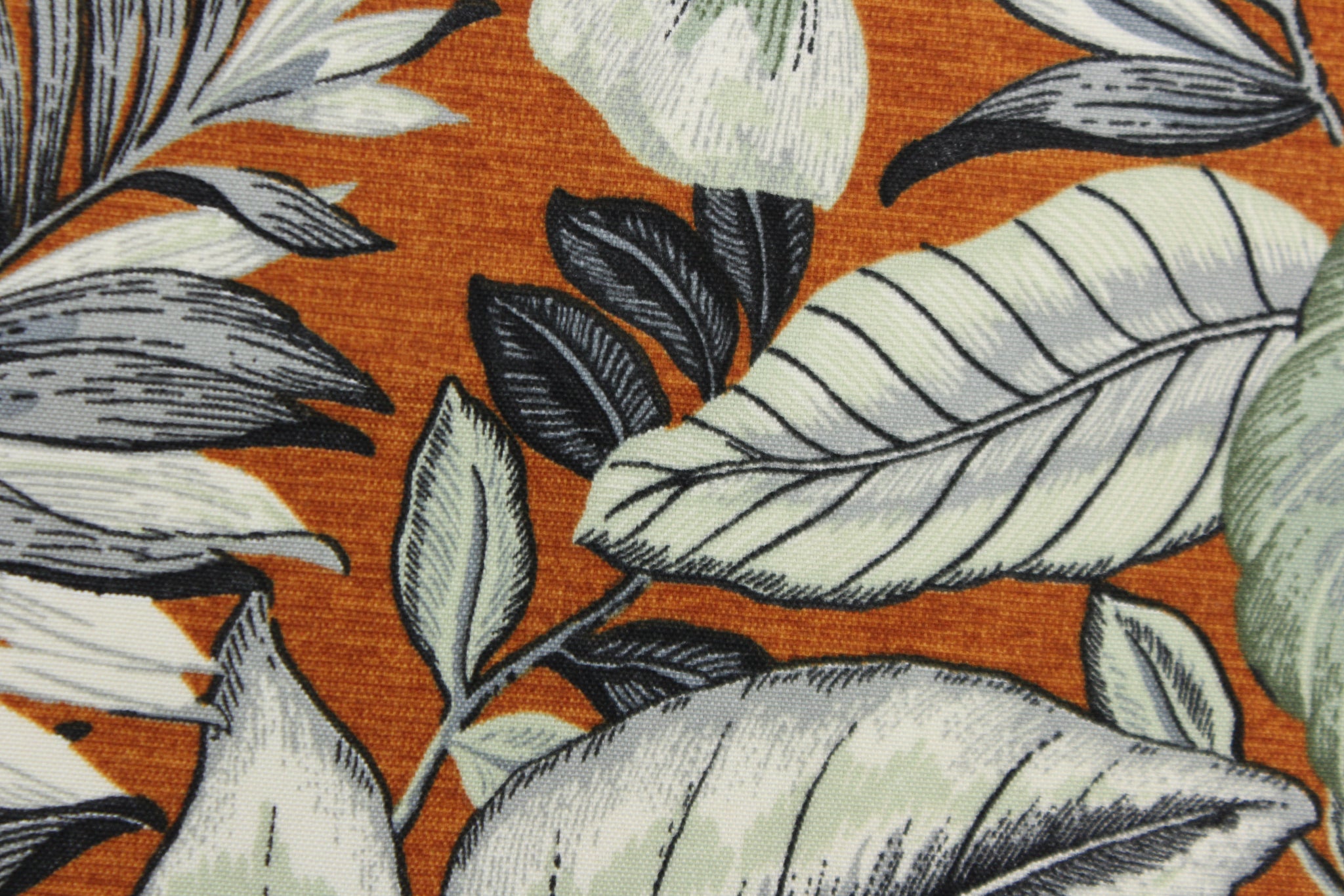 DESCRIPTION: This Solarium outdoor print features a large tropical leaf design in black, gray, white and light green on a dark orange background. This versatile, long-lasting fabric can withstand up to 500 hours of sunlight, water and stain resistant and has 10,000 double rubs. It is perfect for lounge cushions, pool furniture, tablecloths, decorative pillows and upholstery projects. This fabric has a slightly stiff feel but is easy to work with.