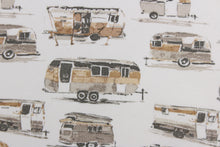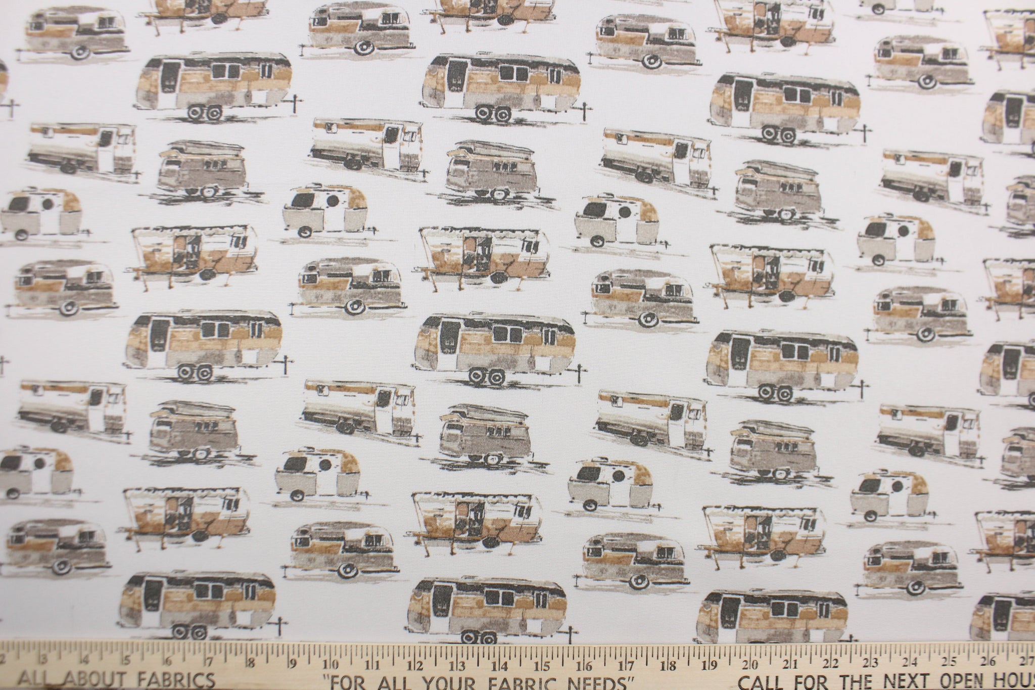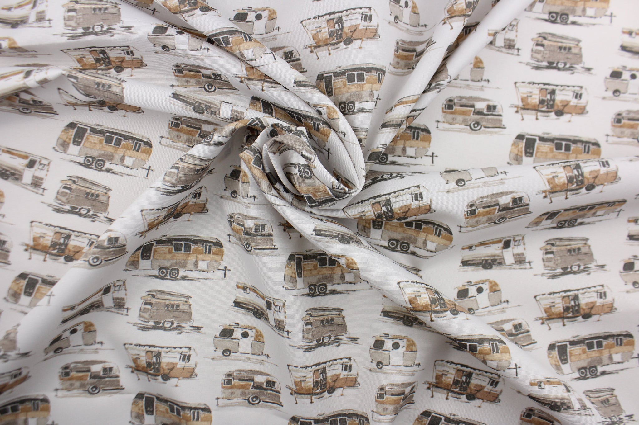 DESCRIPTION: This Solarium outdoor decorative print features campers in various sizes. Colors include shades of brown, black and off-white. This versatile, long-lasting fabric can withstand up to 500 hours of sunlight, water and stain resistant and has 10,000 double rubs. It is perfect for lounge cushions, pool furniture, tablecloths, decorative pillows and upholstery projects. This fabric has a slightly stiff feel but is easy to work with.