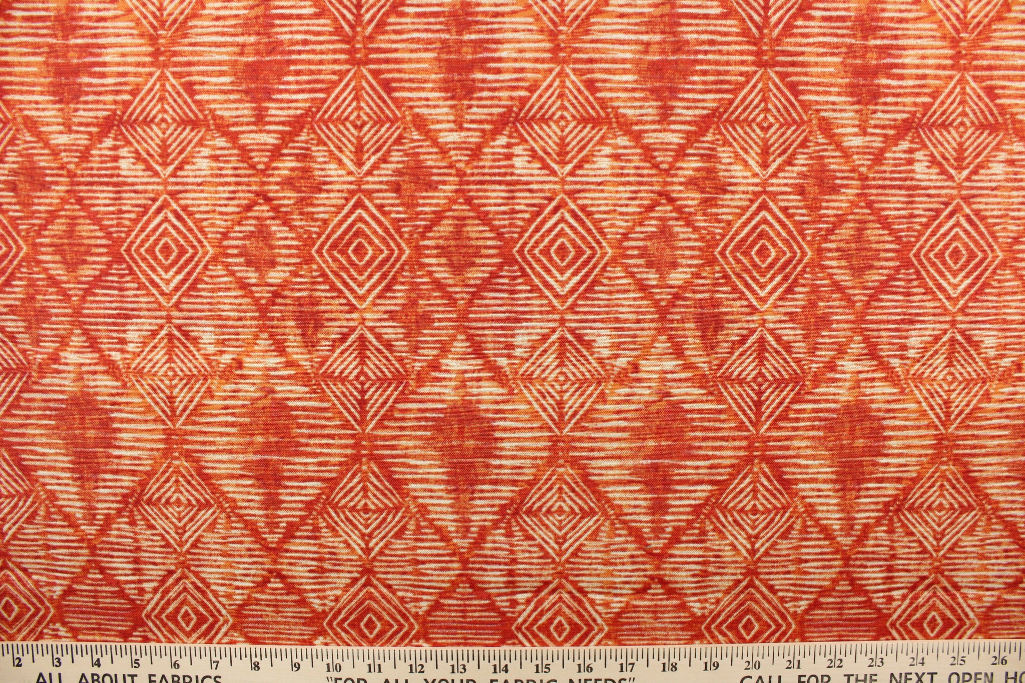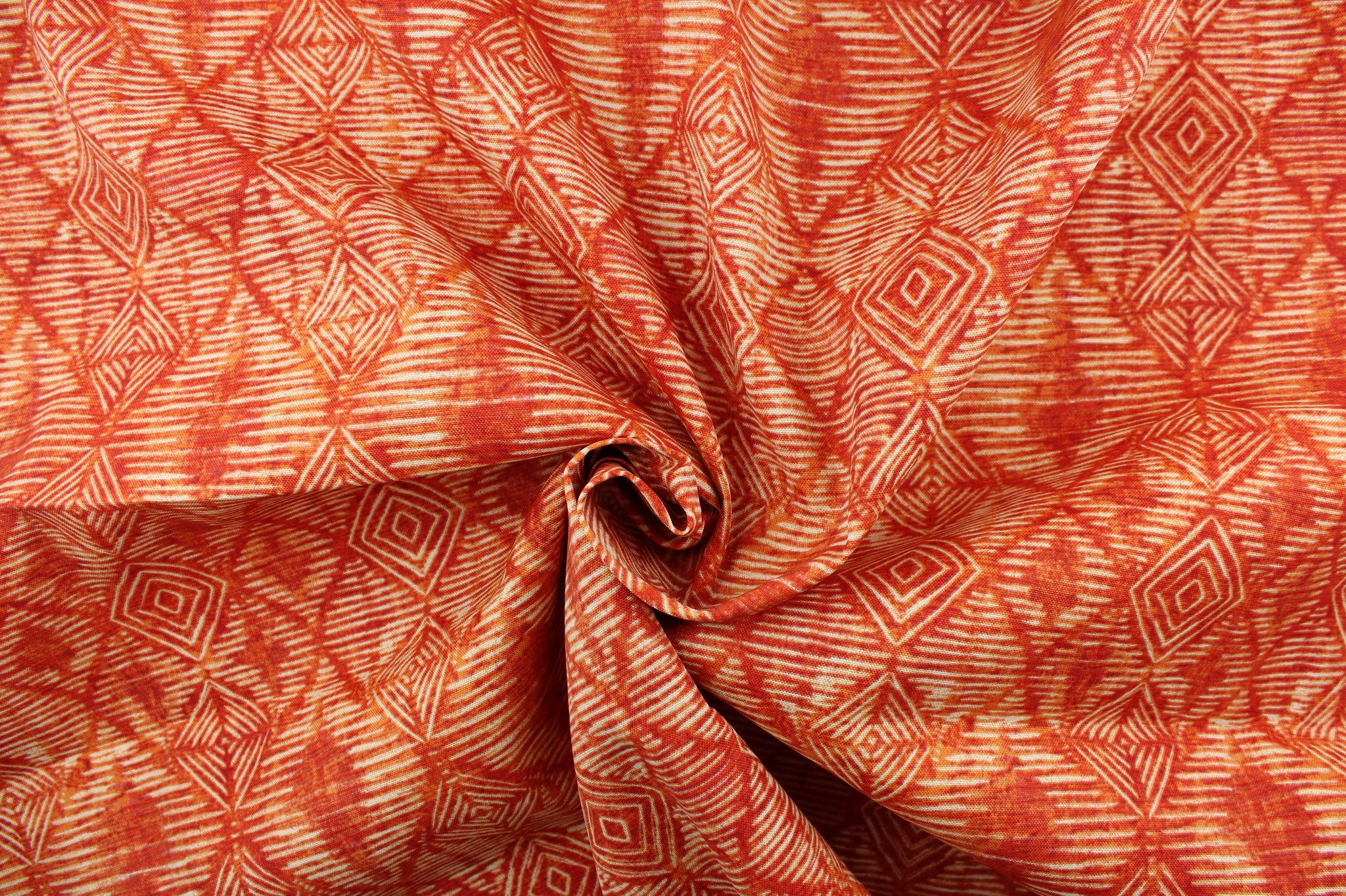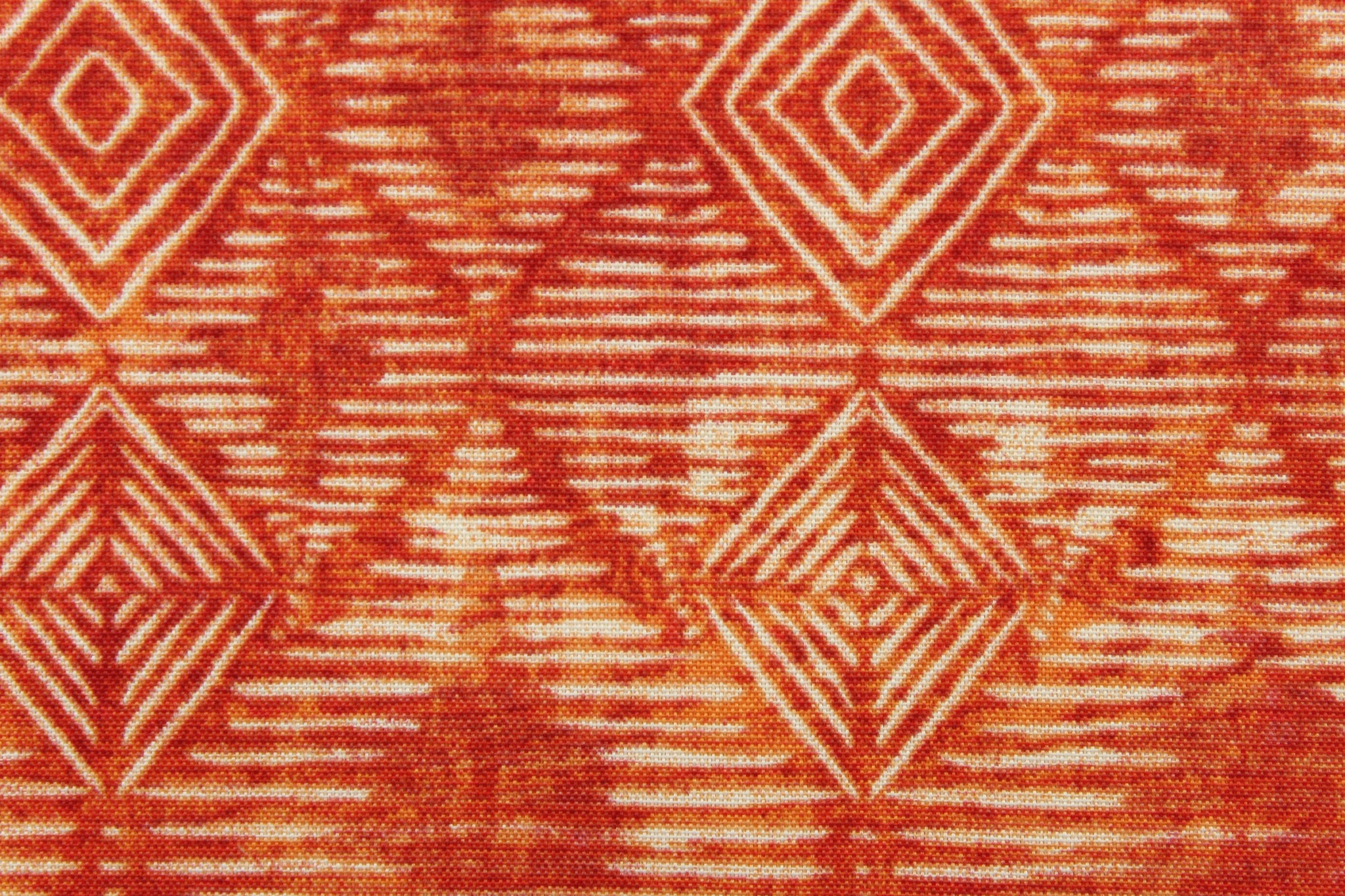 DESCRIPTION:  This fabric features interlocking geometric diamonds in orange and is perfect for any project where the fabric will be exposed to the weather.  Able to resist stains and water, UV tested and can withstand 500 hours of direct sunlight  Uses include cushions, tablecloths, upholstery projects, decorative pillows and craft projects. This fabric has a slightly stiff feel but is easy to work with.