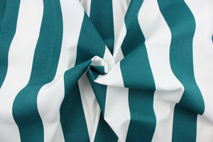 DESCRIPTION:  This indoor/outdoor fabric in teal and white stripes is perfect for any project where the fabric will be exposed to the weather.  It is fade resistant and UV tested and can withstand 1000 hours of direct sunlight.  It is also stain and water repellant and has a resistance to bleach, dirt and mildew.  Uses include cushions, tablecloths, upholstery projects, decorative pillows and craft projects. This fabric has a slightly stiff feel but is easy to work with.  We offer this fabric in many different colors.