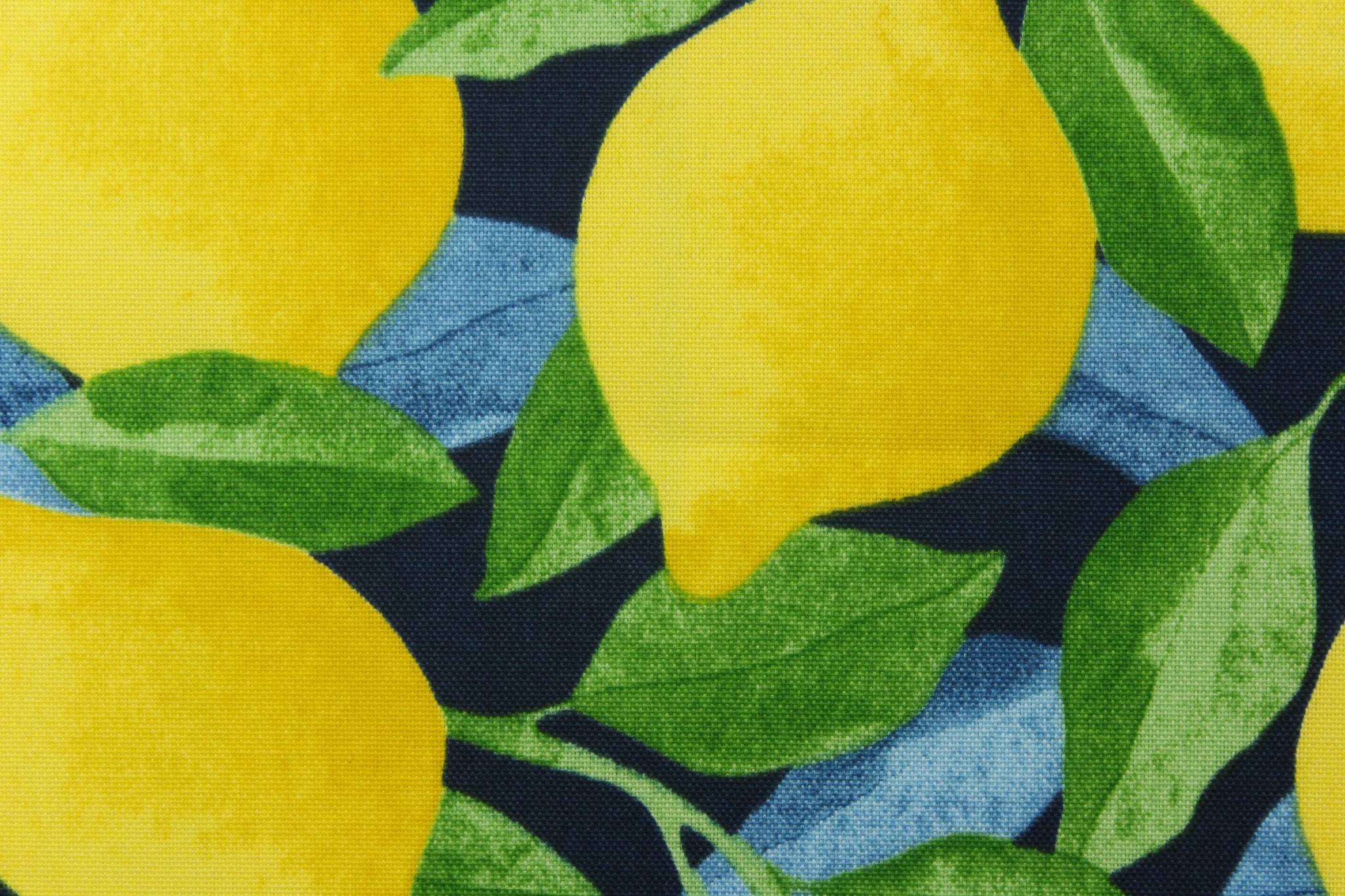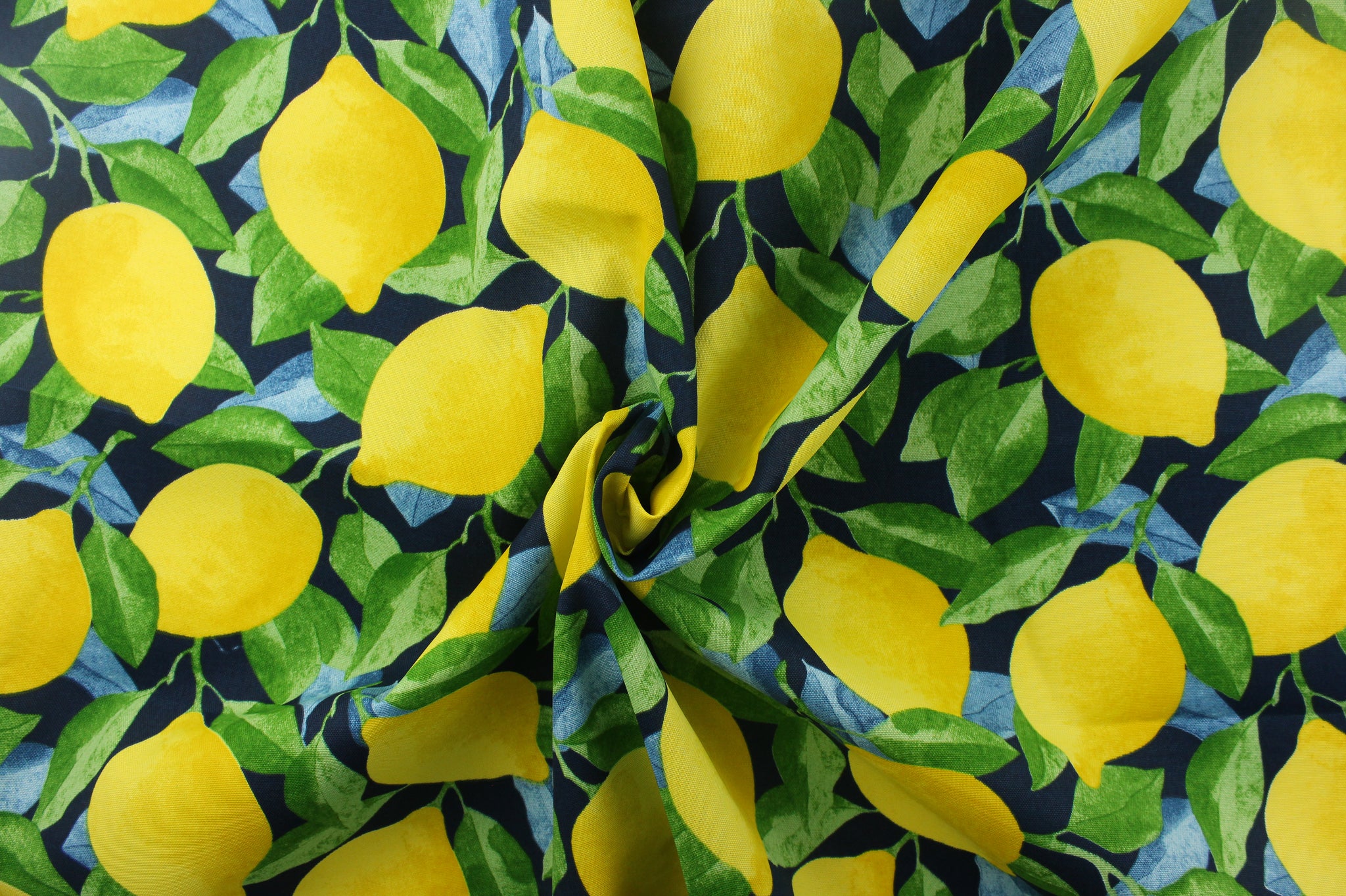 DESCRIPTION: This beautiful outdoor design features lemons in yellow with green and blue leaves on a dark blue background. Solarium fabric its able to resist stains, resist water, withstand up to 500 hours of sunlight and rated at 10,000 double rubs. It is perfect for outdoor pillows, cushions, upholstery, totes, ect..
