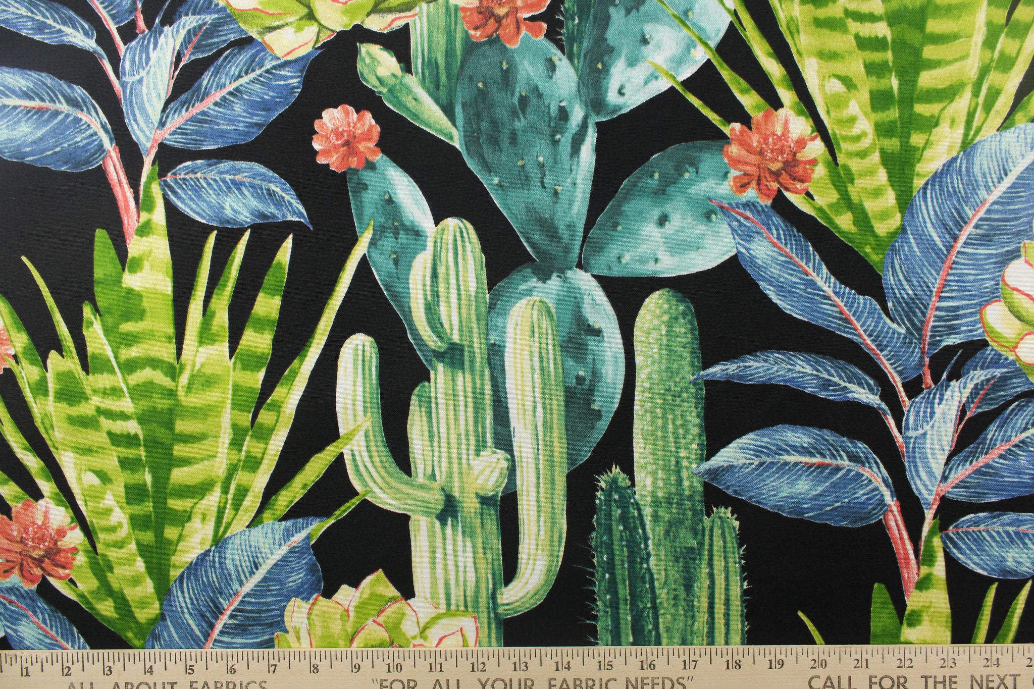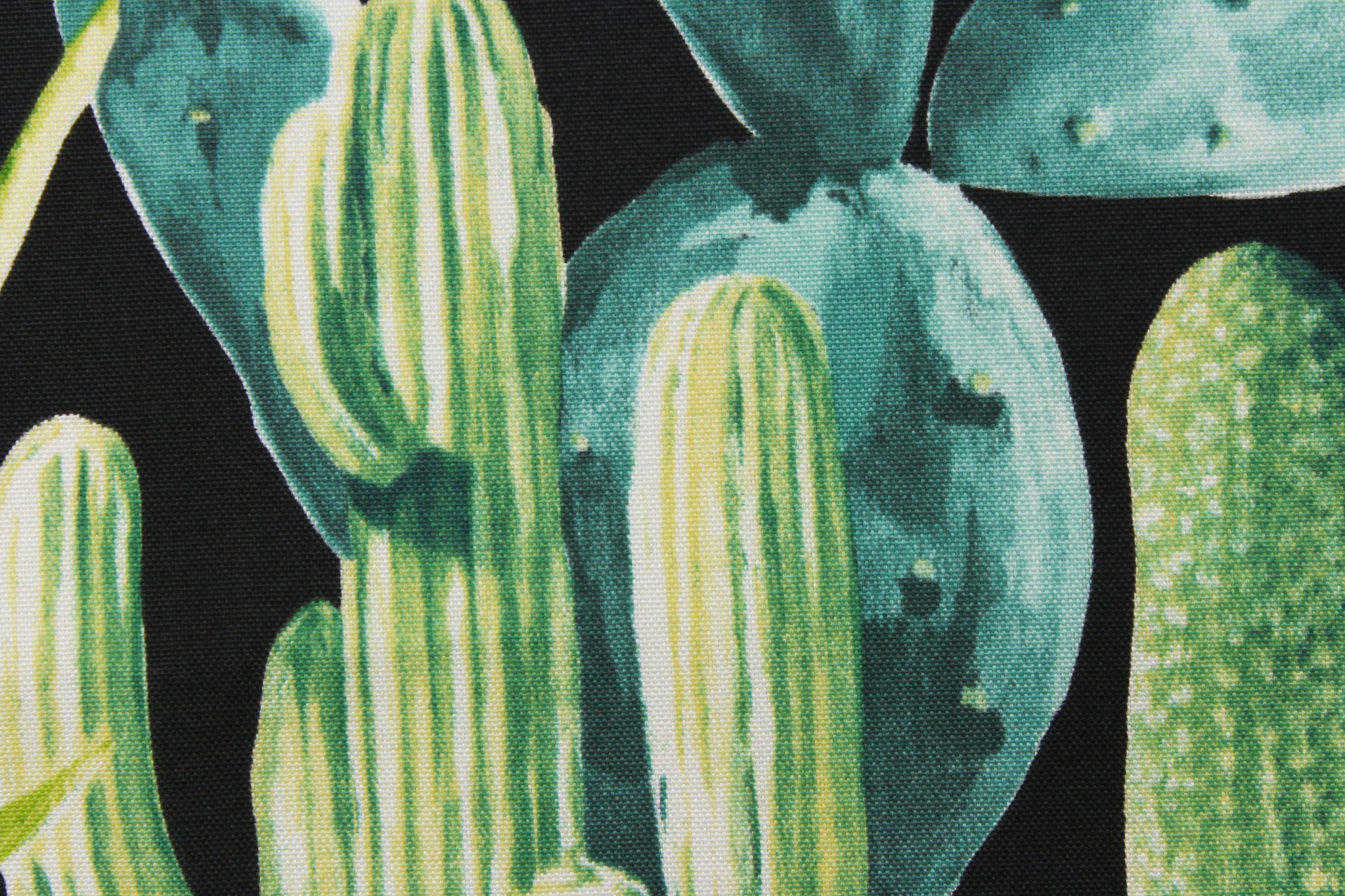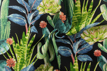 DESCRIPTION: This beautiful cactus design in greens, white, pale yellow, peachy pink, blue and teal against a black background. Solarium fabric its able to resist stains, resist water, withstand up to 500 hours of sunlight and rated at 10,000 double rubs. It is perfect for outdoor pillows, cushions, upholstery, totes, ect..