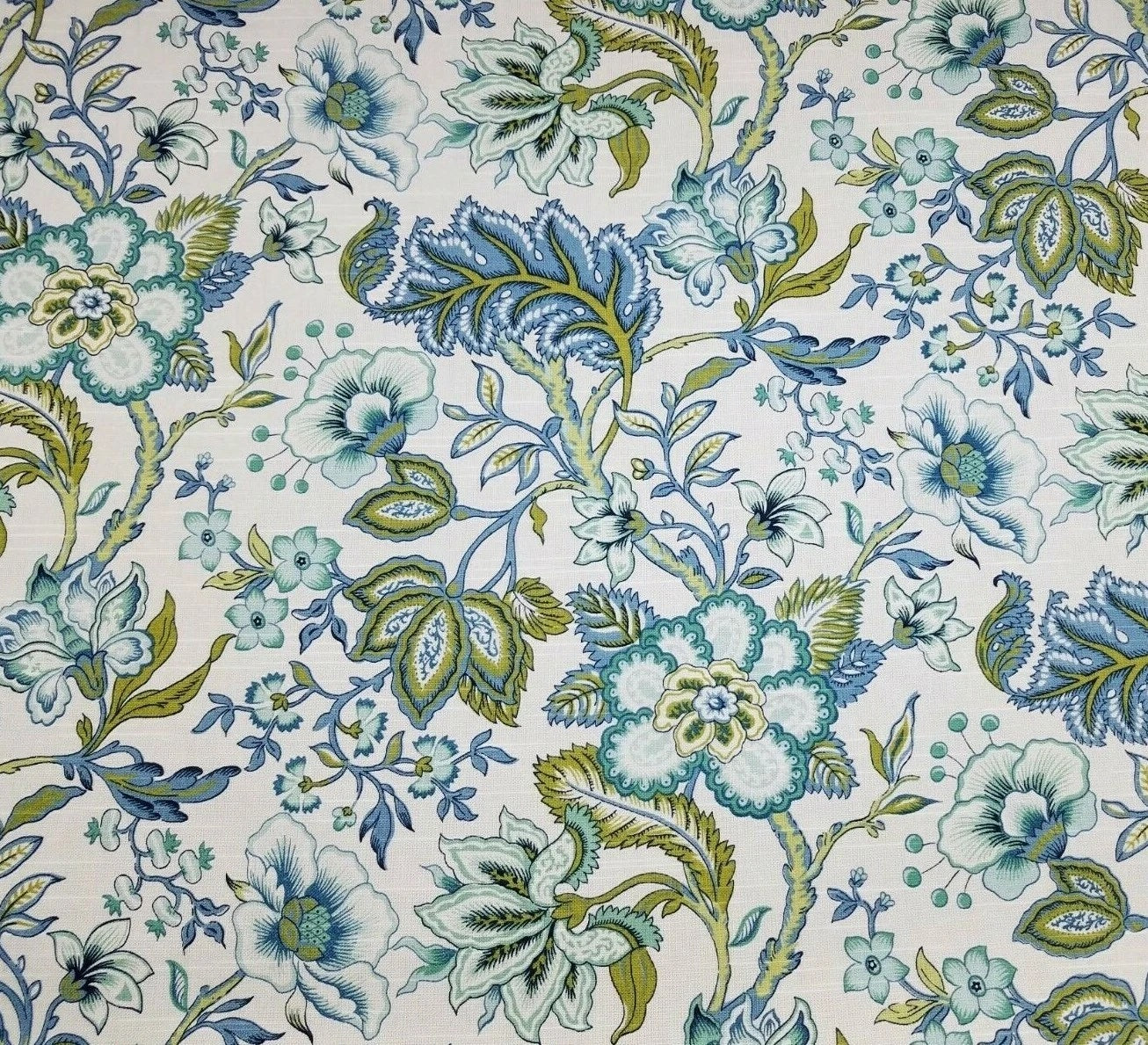DESCRIPTION: Transform your living space with the beautifully rendered traditional Jacobean design. The livable color palette of blues and greens on an ivory fabric is perfect for today's design décor.