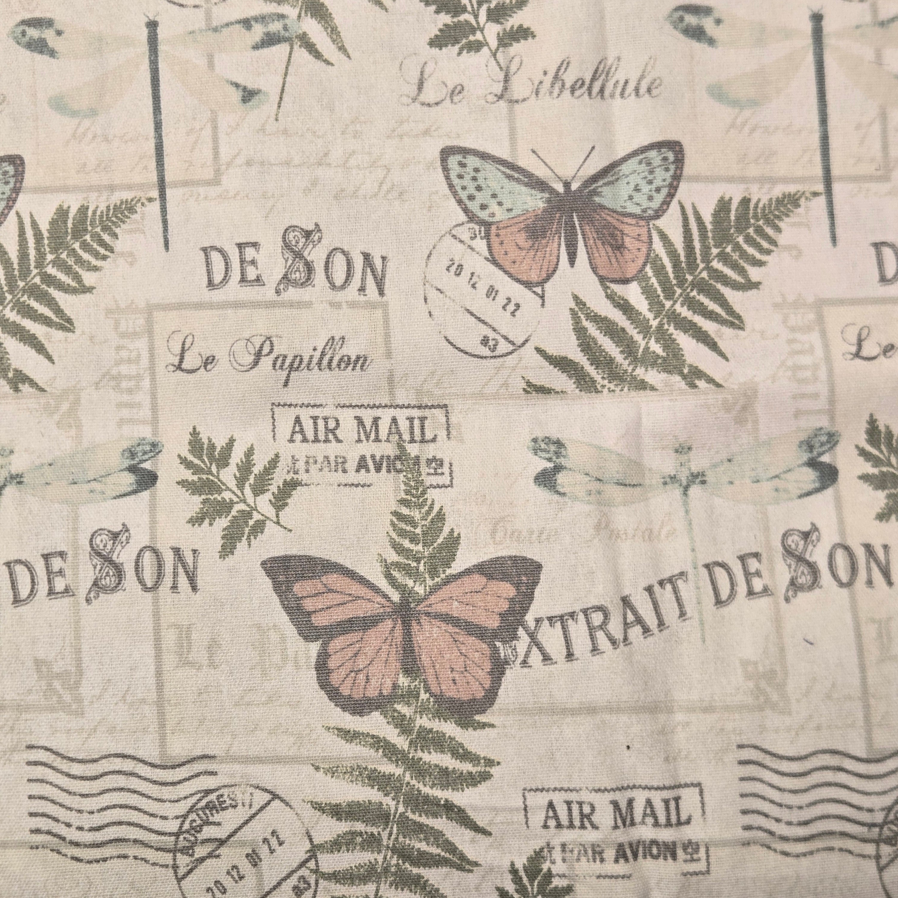 DESCRIPTION: The French Papillon or the Monarch Butterfly with French script and botanical design. The color registration shows the colors black, grey, light blue, rose and green on an off-white antique background.