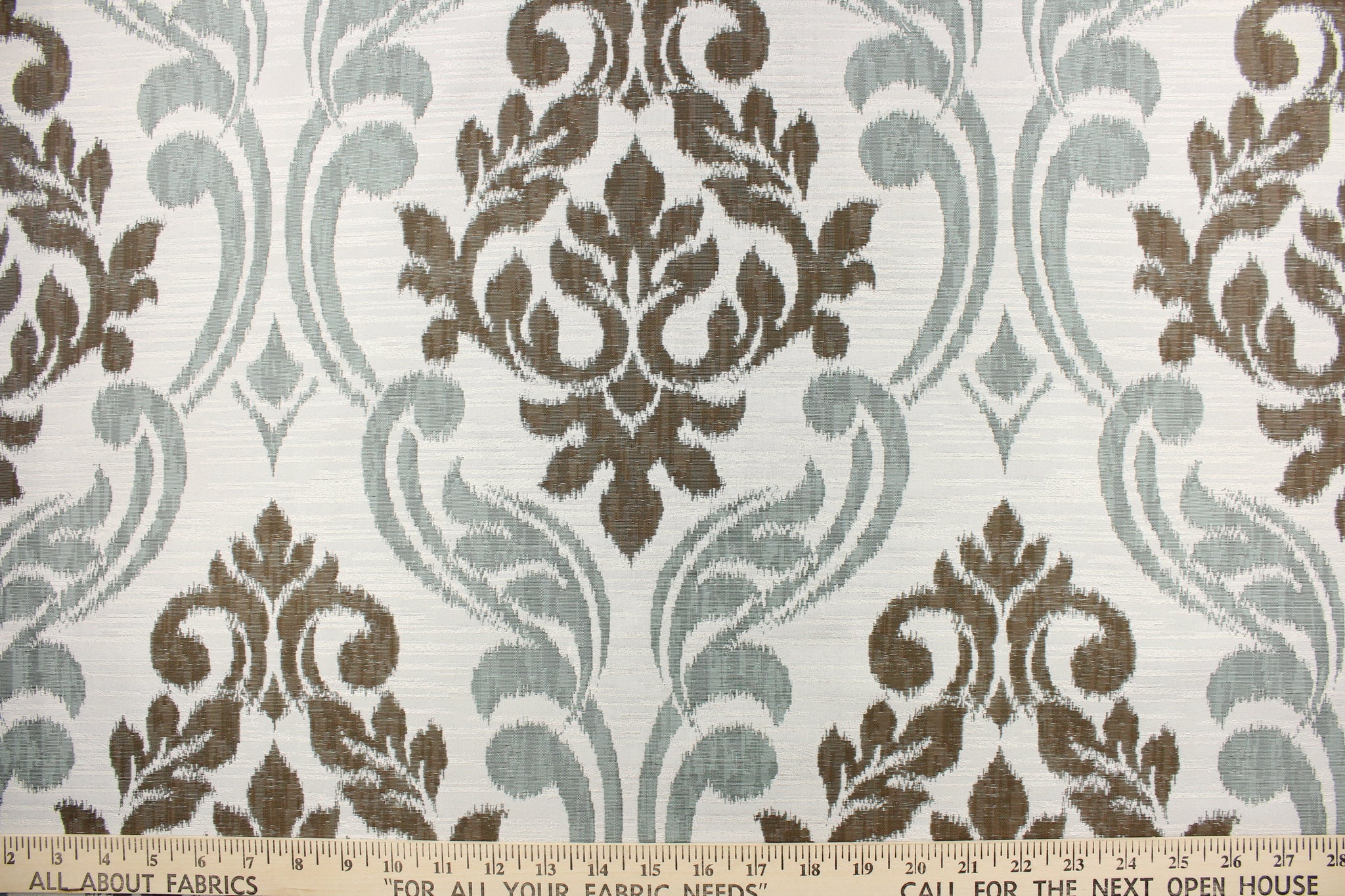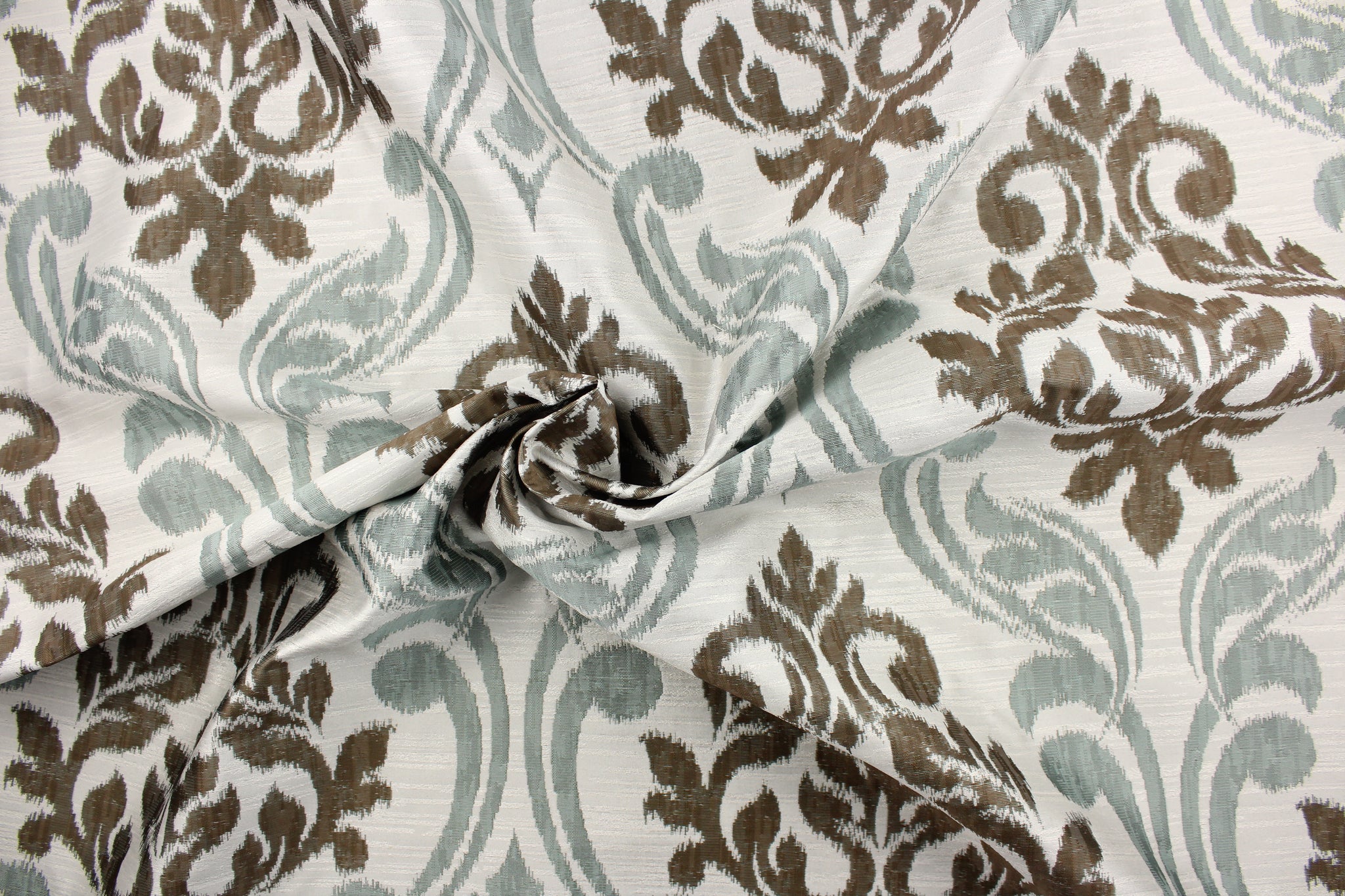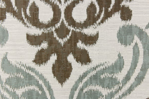 DESCRIPTION: This fabric features a large medallion design in the colors of pistachio, brown and white and has a destressed look which enhances the design. It has a soft drapable hand and would be ideal for swags, window scarves and drapery panels.