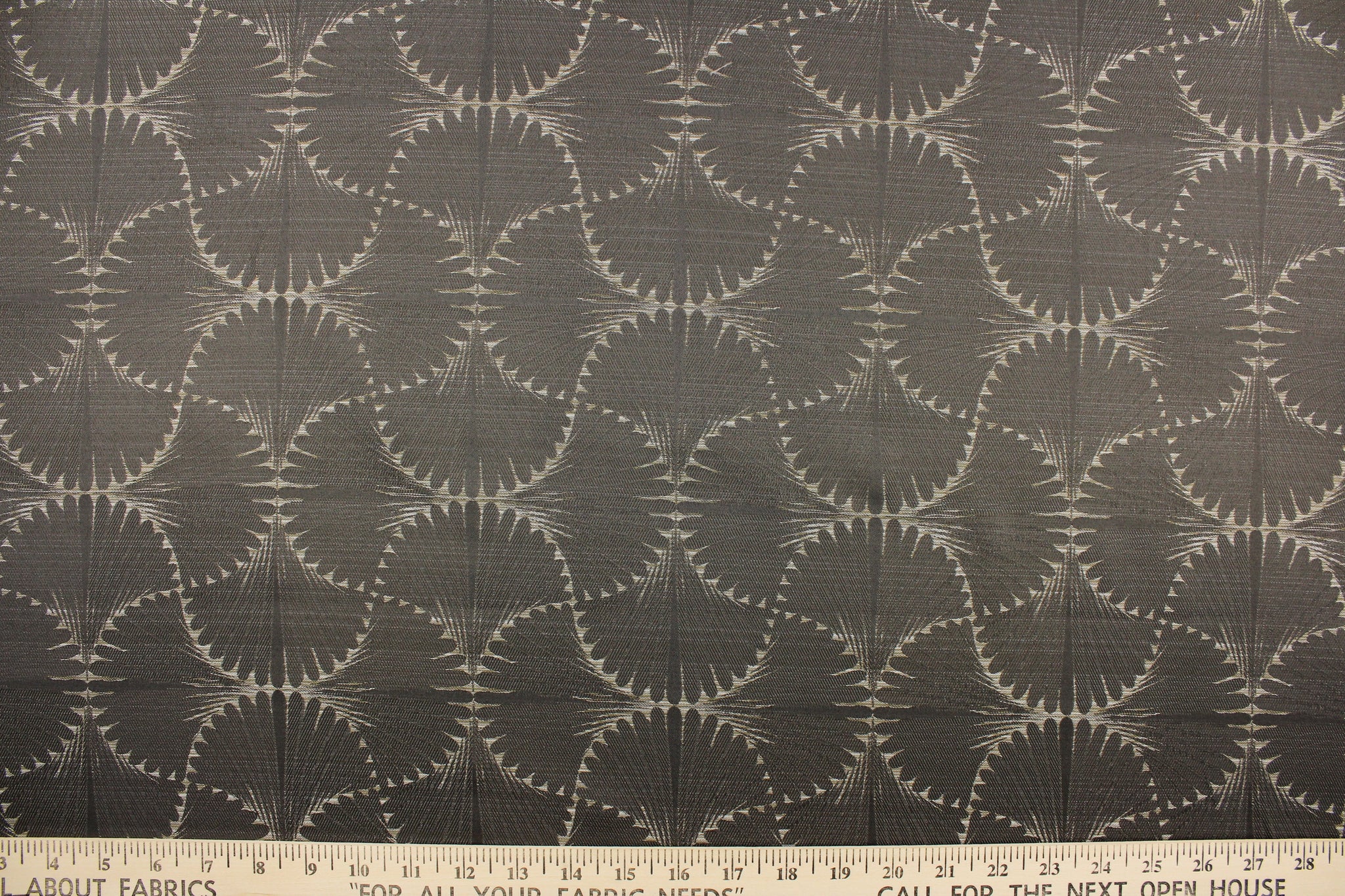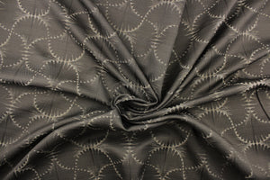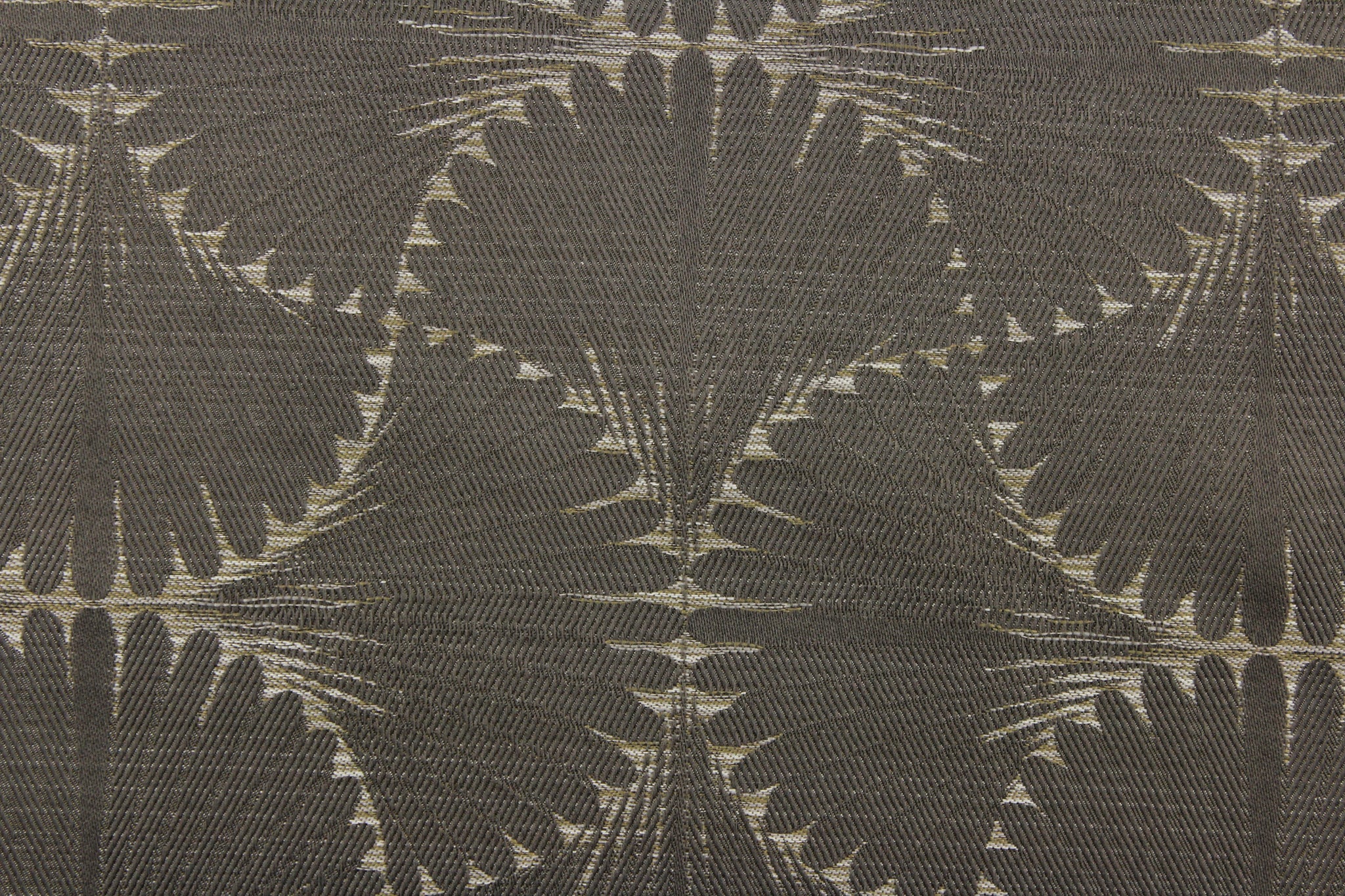 DESCRIPTION: This jacquard fabric features a whimsical print in light beige on a taupe background. It is great for home decor such as multi-purpose upholstery, window treatments, pillows, duvet covers, tote bags and more. It has a soft workable feel yet is stable and durable with a rating of 15,000 double rubs.