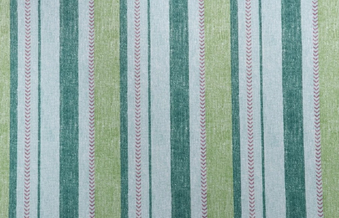 DESCRIPTION: Richloom Solarium Weekender Outdoor Fabric in Palm features a broad, textured green stripe alternating with a narrower, lighter green stripe. The thin off-white stripes have a decorative element running down the center chevron pattern. The fabric is fade resistant and UV tested and can withstand 500 hours of direct sunlight. It is also stain and water repellant and has a resistance to dirt and mildew.