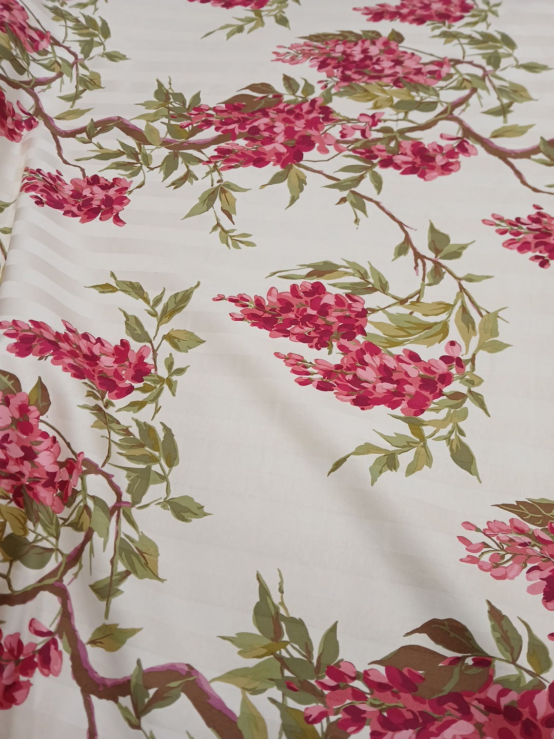 DESCRIPTION: A vintage Richloom fabric features a cream jacquard fabric with fuchsia wisteria growing among the trees.