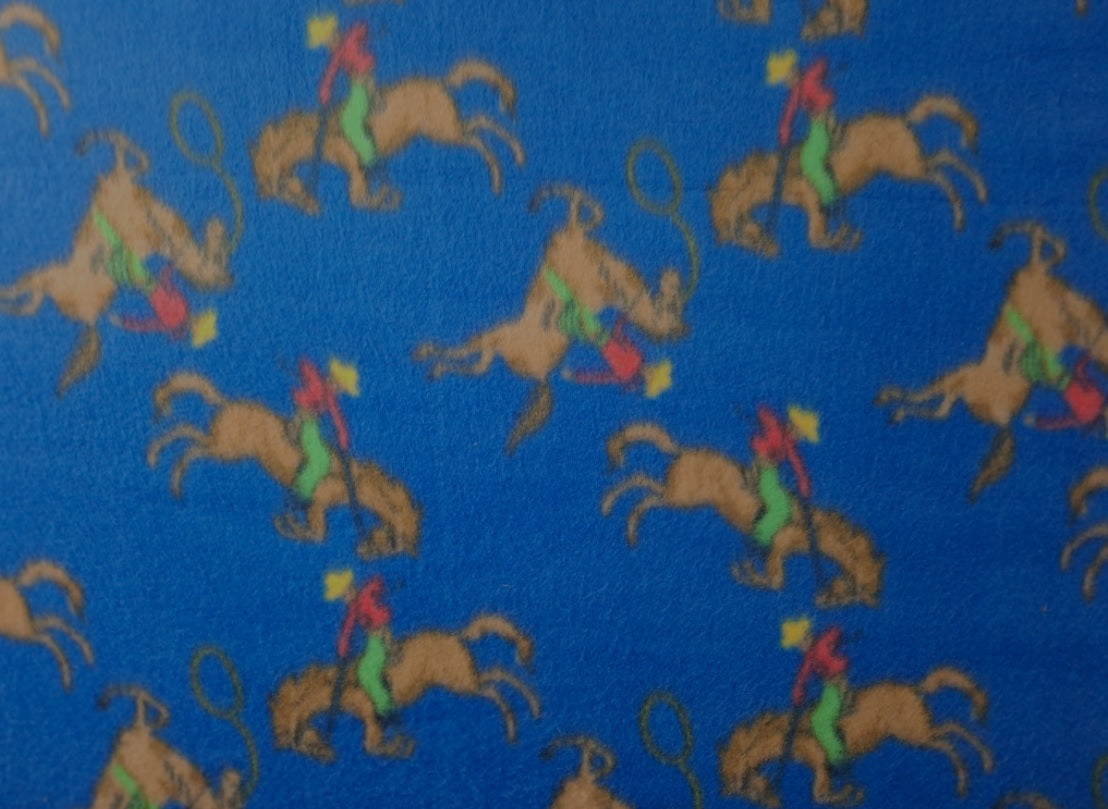 DESCRIPTION: Ride 'Em Cowboy Polar Fleece Fabric in Blue is a soft plush fabric, that is cozy, warm, lightweight, and easy to care for. Get creative with this versatile fabric and show-off your DIY skills! The color registration shows the colors brown, red, green and yellow on a dark blue background.
