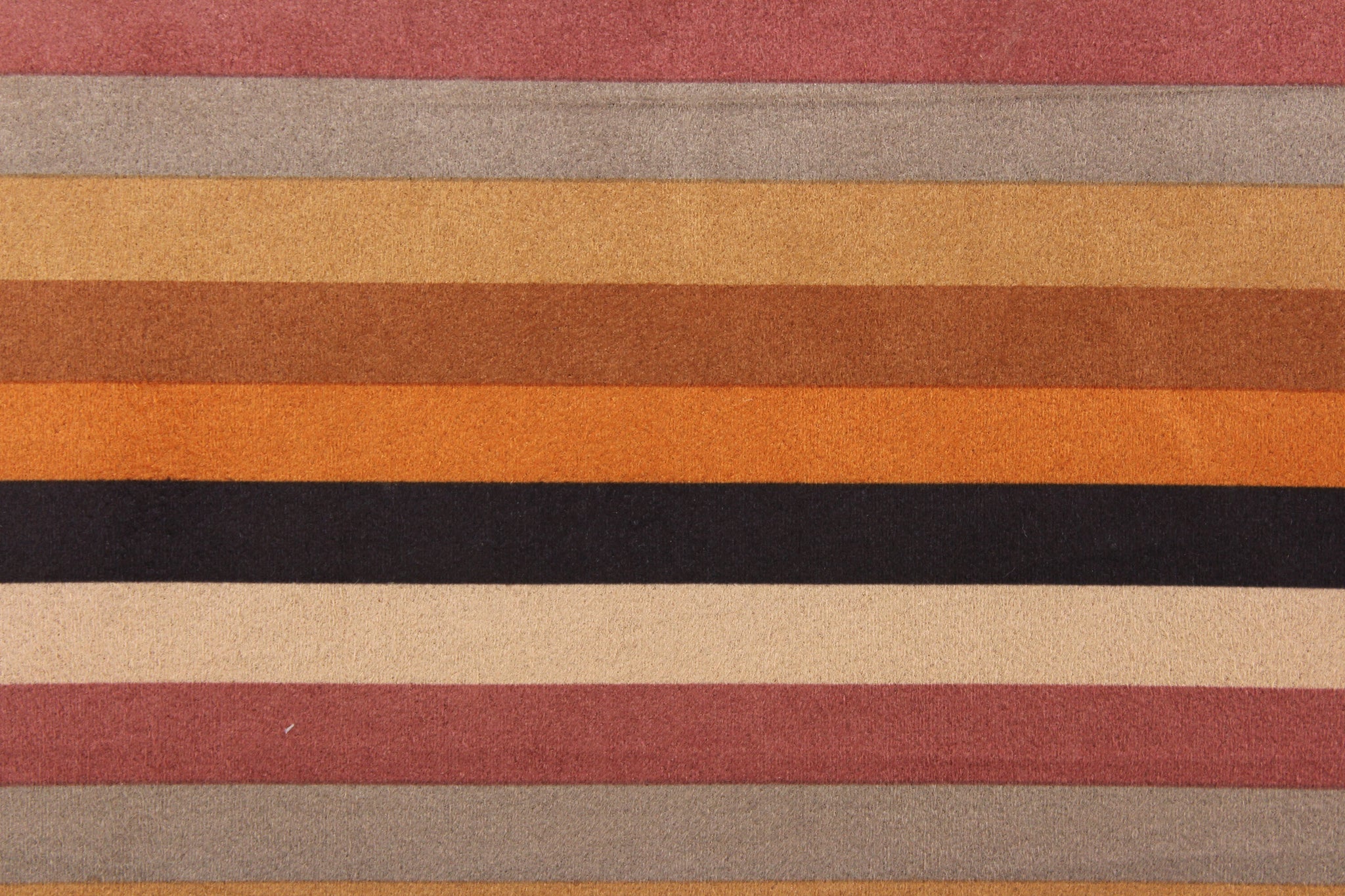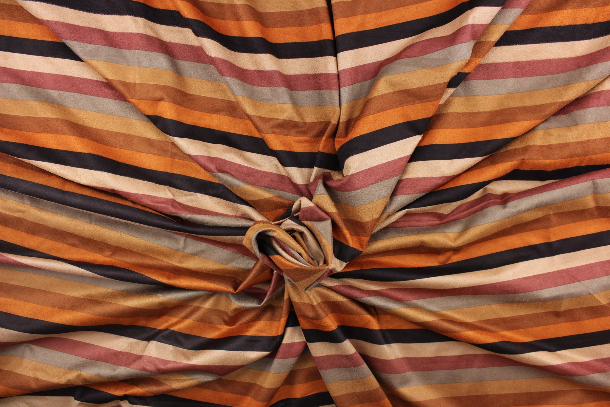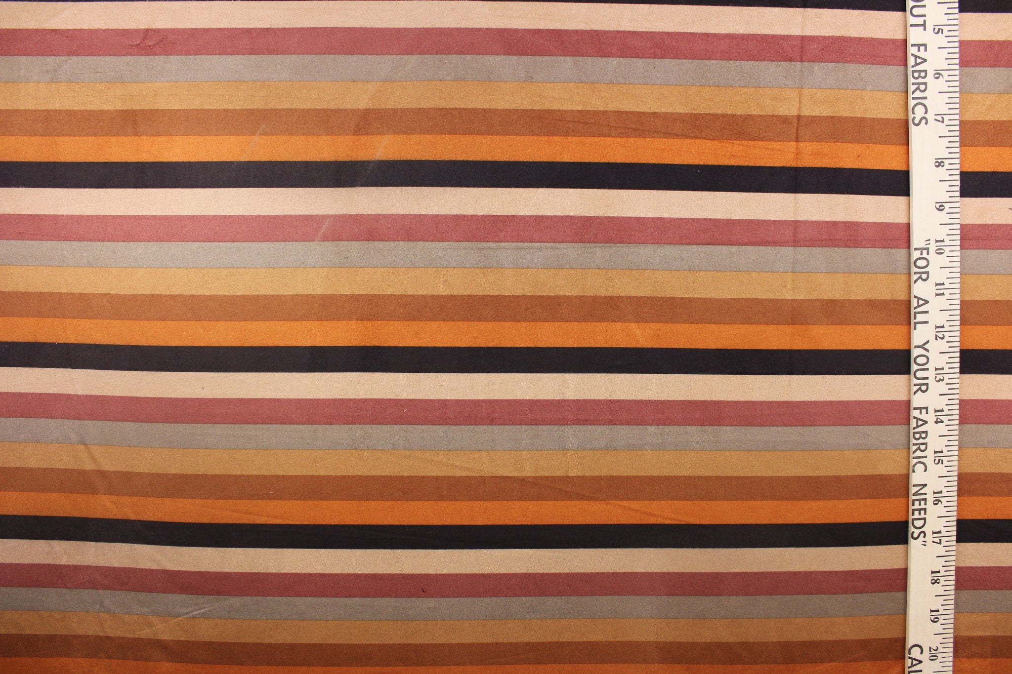 DESCRIPTION: This suede lycra fabric features a stripe design in orange, nude, brown, tan, beige, dusty rose, and taupe . Use this for apparel, etc. We have this design in one other color. We offer a variety of suede and lycra fabrics.