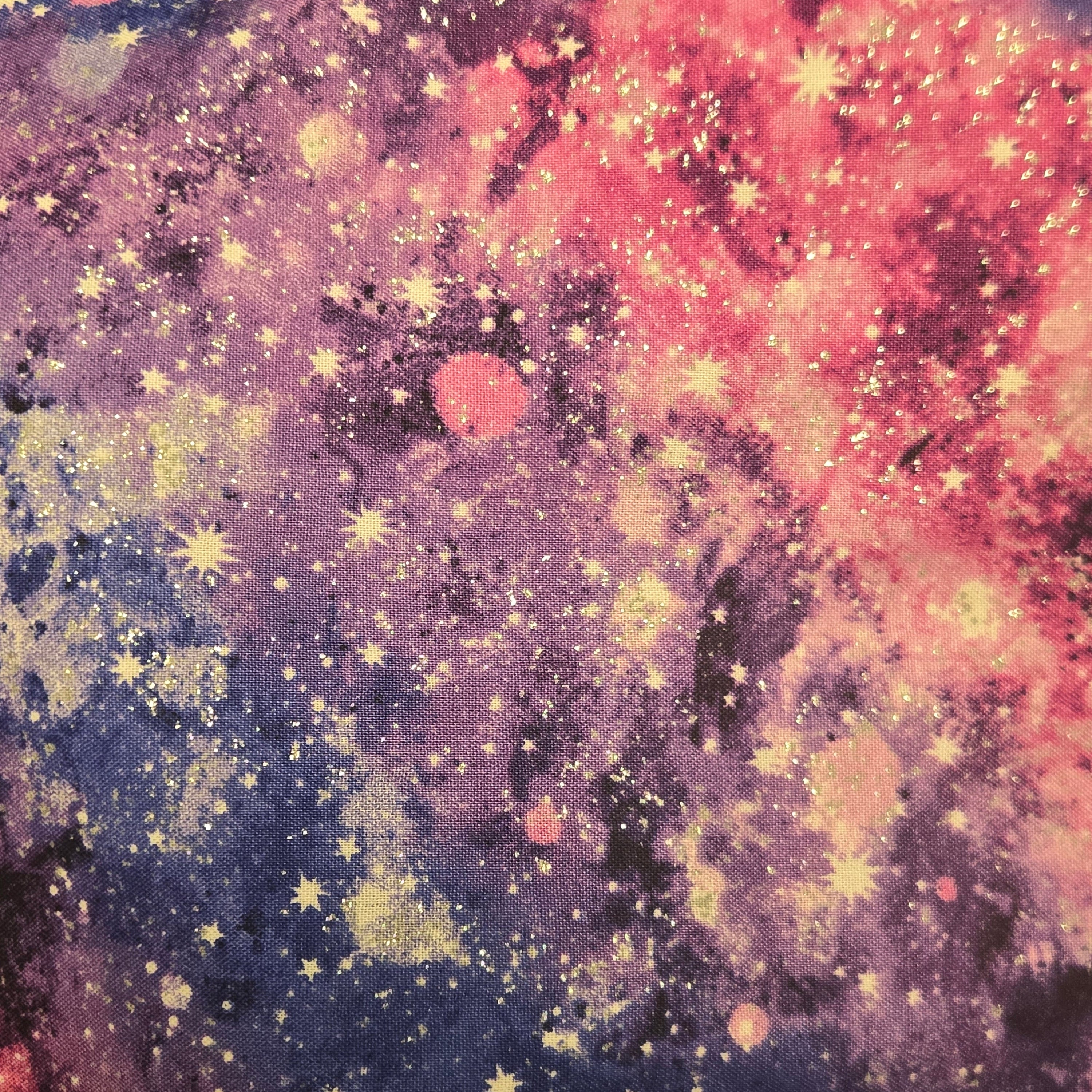 DESCRIPTION: Starry Galaxy Quilting Fabric in Blue/Purple features a vibrant and detailed "galaxy" or "outer space" theme, characterized by a blend of deep blues, purples, and pinks that seamlessly transition into one another, creating a nebula-like effect.