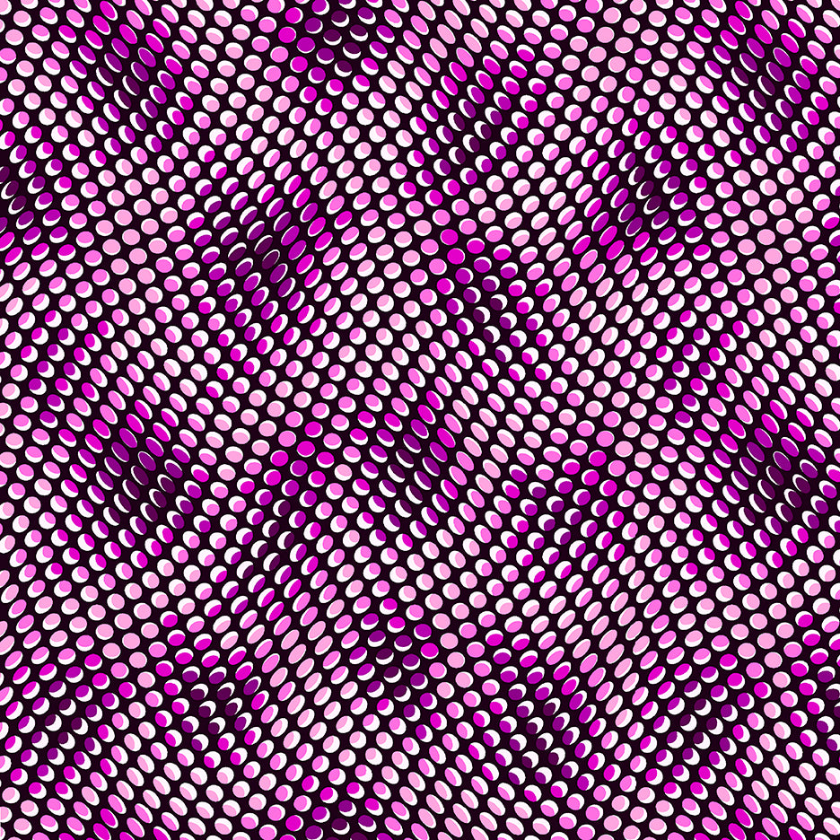 DESCRIPTION: Stof Fabrics 4515-285 Quilters Coordinates Purple II features dots of different sizes and colors arranged and highlighted to create psychedelic waves.