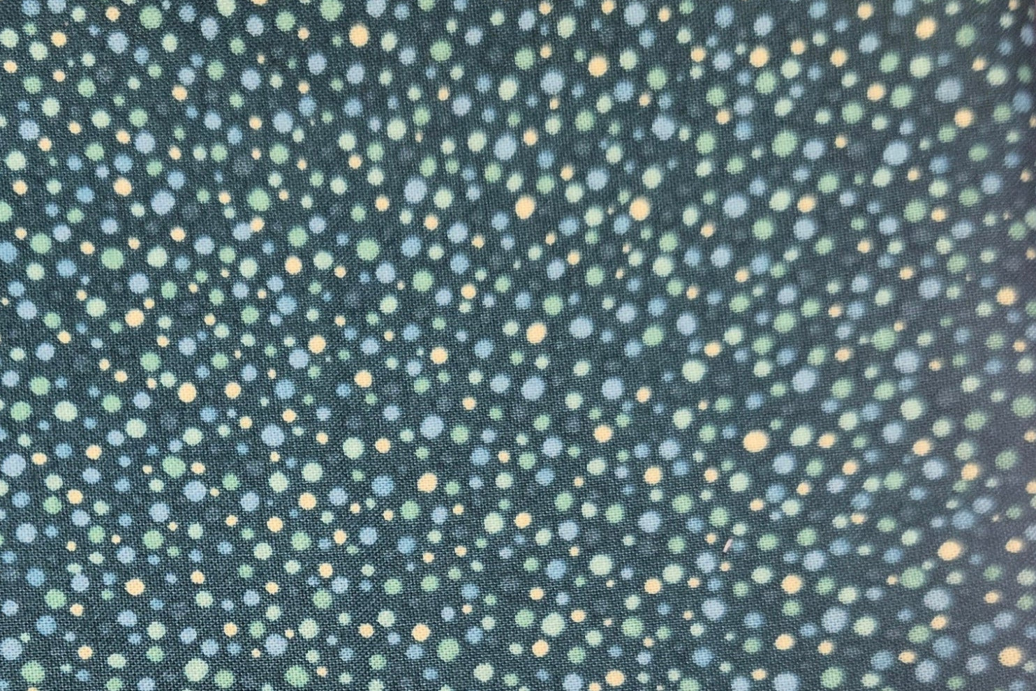 DESCRIPTION: Stof Fabrics' Quilters Coordinates Dizzy Dots Quilting Fabric in Teal features deep, dark blue background. Scattered across this background are numerous small, irregularly sized dots in various shades of lighter blue, teal, and cream. The dots appear randomly placed, creating a textured and dappled effect.