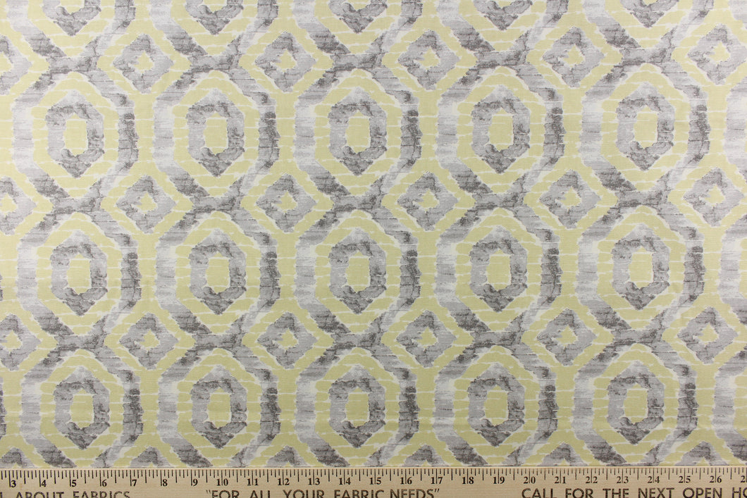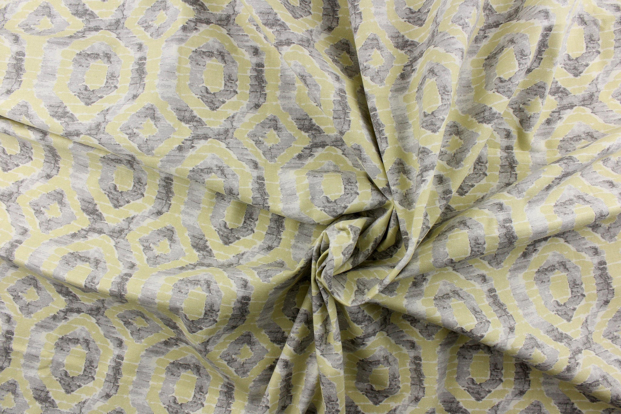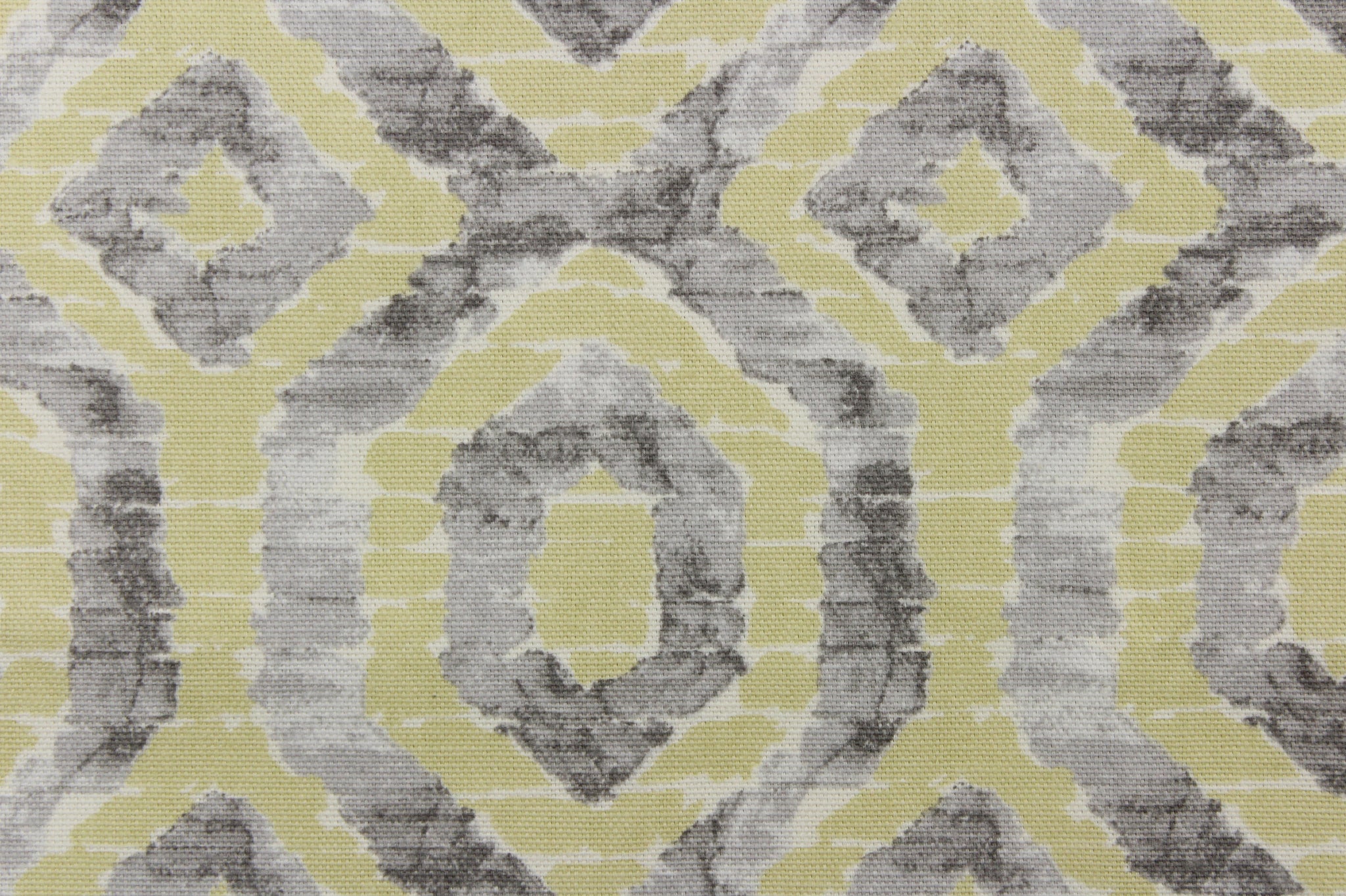 DESCRIPTION: This beautiful fabric features a geometric design in gray and a pale yellowish green color with hints of white. Adding to the design is a slight distressed look. Use this for pillows, drapery, bedding, upholstery, etc. We offer this design in one other color also.