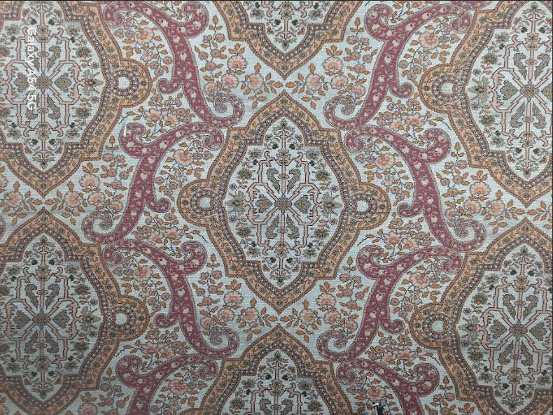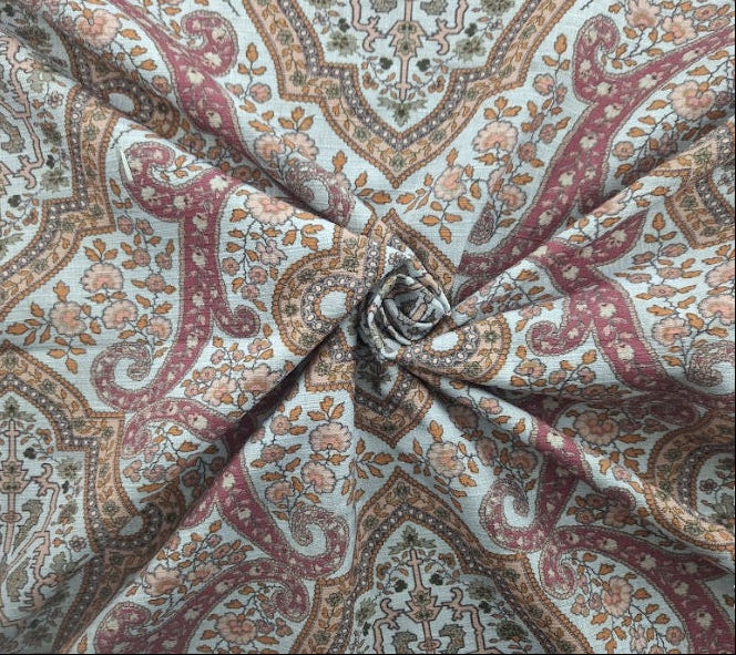 DESCRIPTION: Swavelle Mill Creek Avalon Fabric in Rosewood features an intricate and symmetrical, centered around a stylized medallion/floral motif. This central element is surrounded by large, curved, teardrop-shaped figures, similar to a paisley design. The overall composition suggests a traditional and aesthetic design reminiscent of a tapestry. tablecloth. The color palette is muted and warm, primarily consisting of various shades of pink, peach, and brown. These colors are set against a lighter light blue background on a linen weave fabric