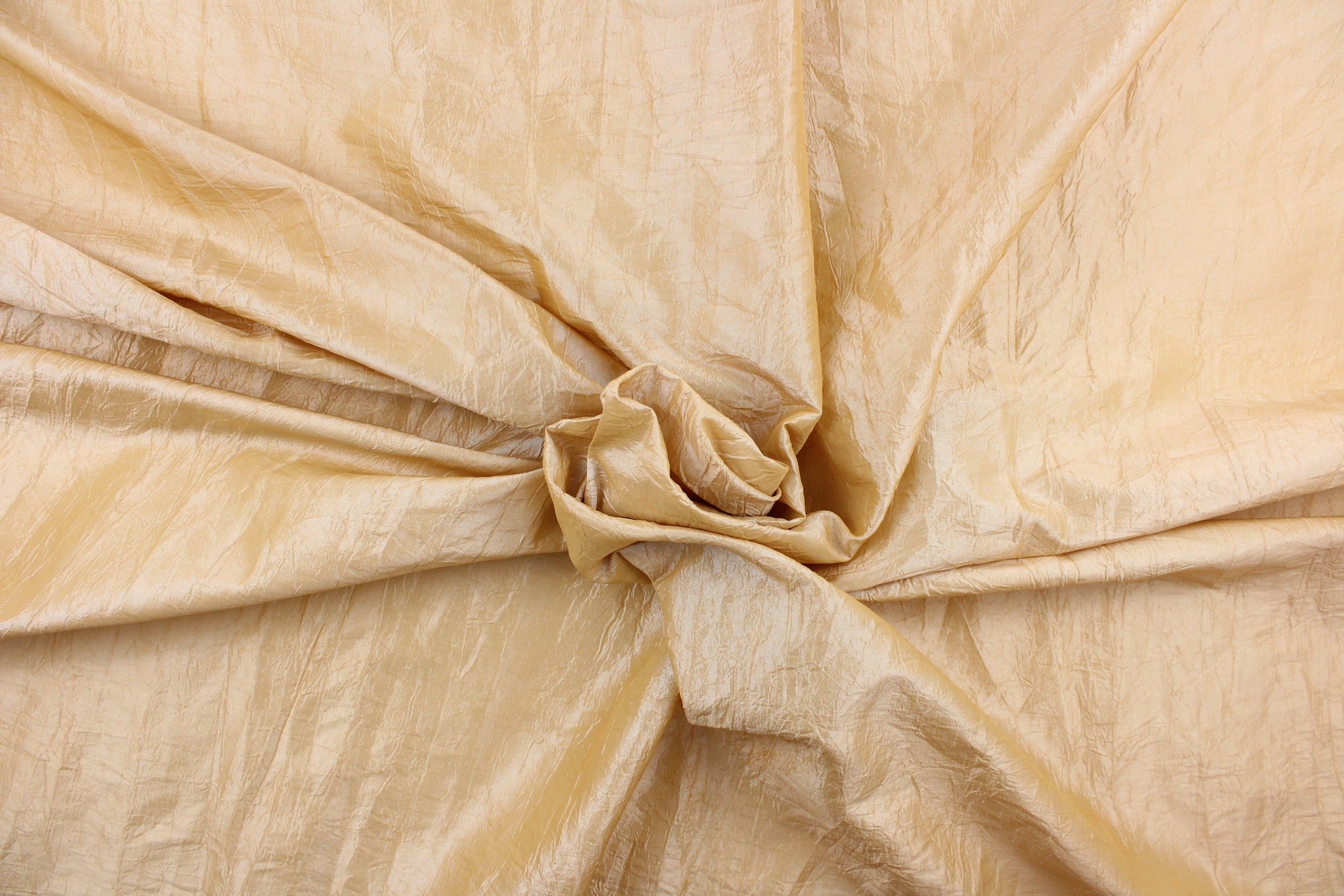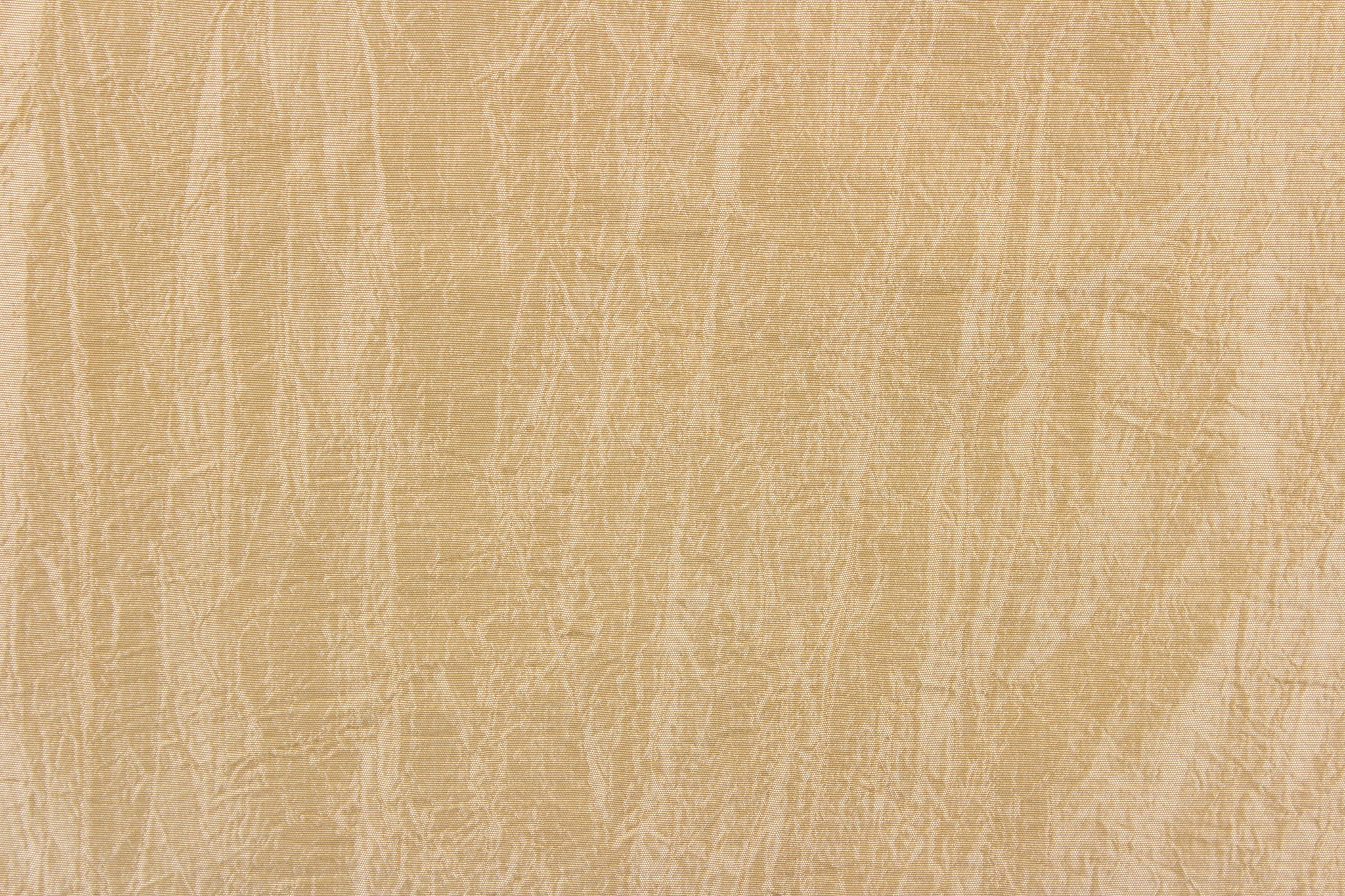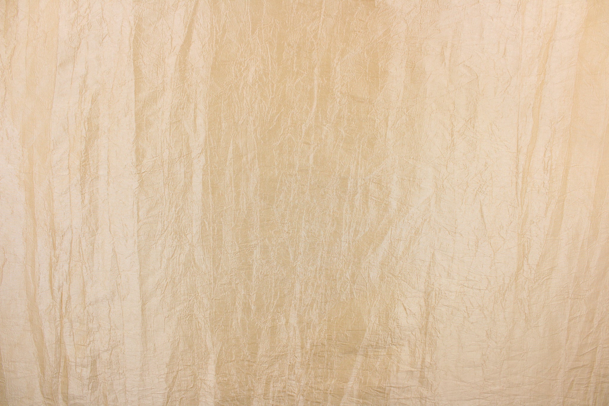 DESCRIPTION: Valmont Crushed Iridescent Taffeta in Italian Straw is a straw gold color fabric that creates luminous colors when seen from different angles. The fabric also has a unique, crushed, textured appearance that is achieved during the manufacturing process.