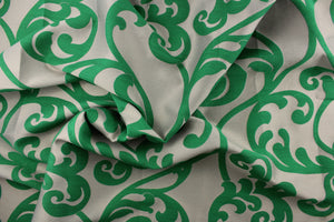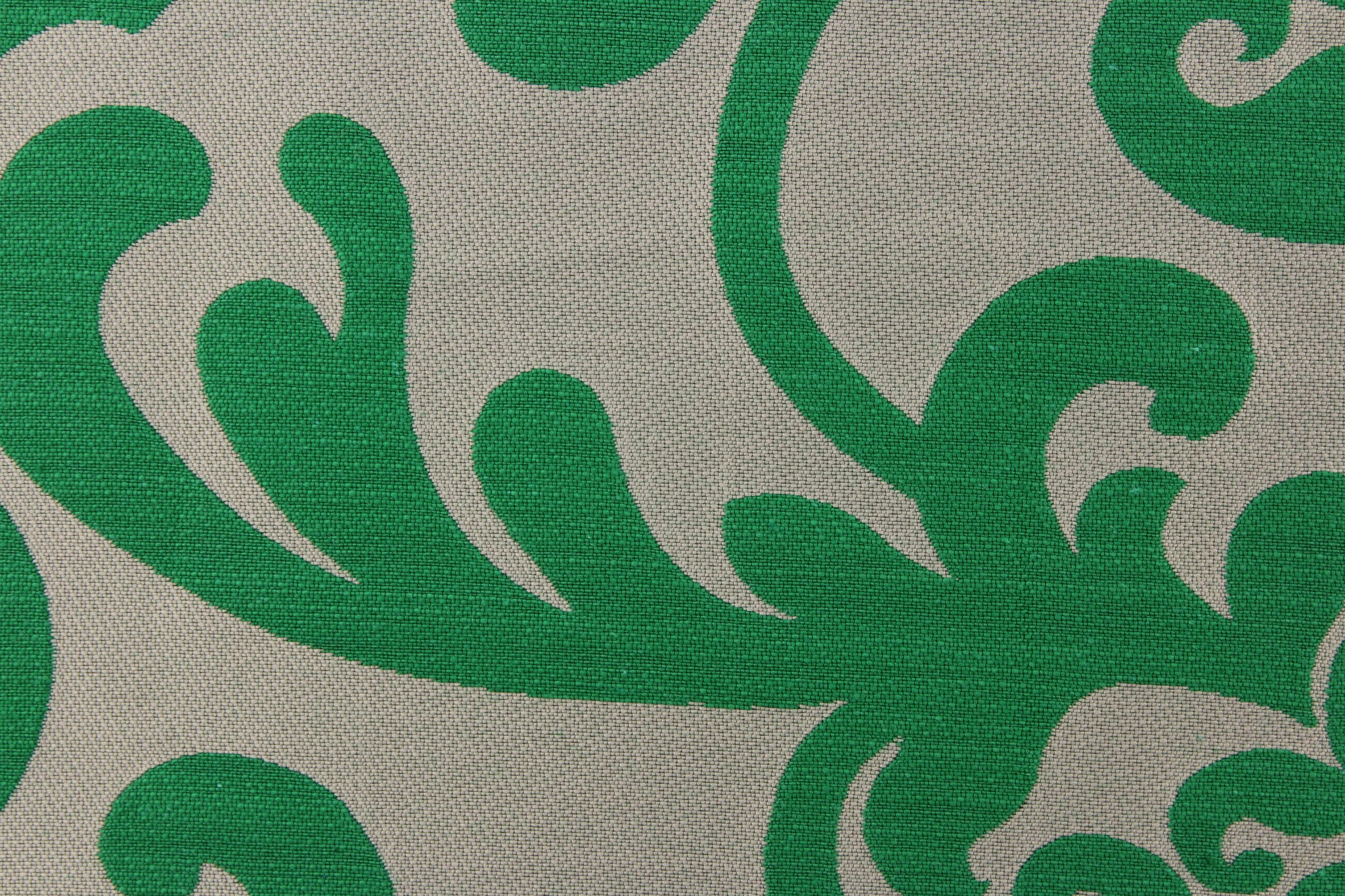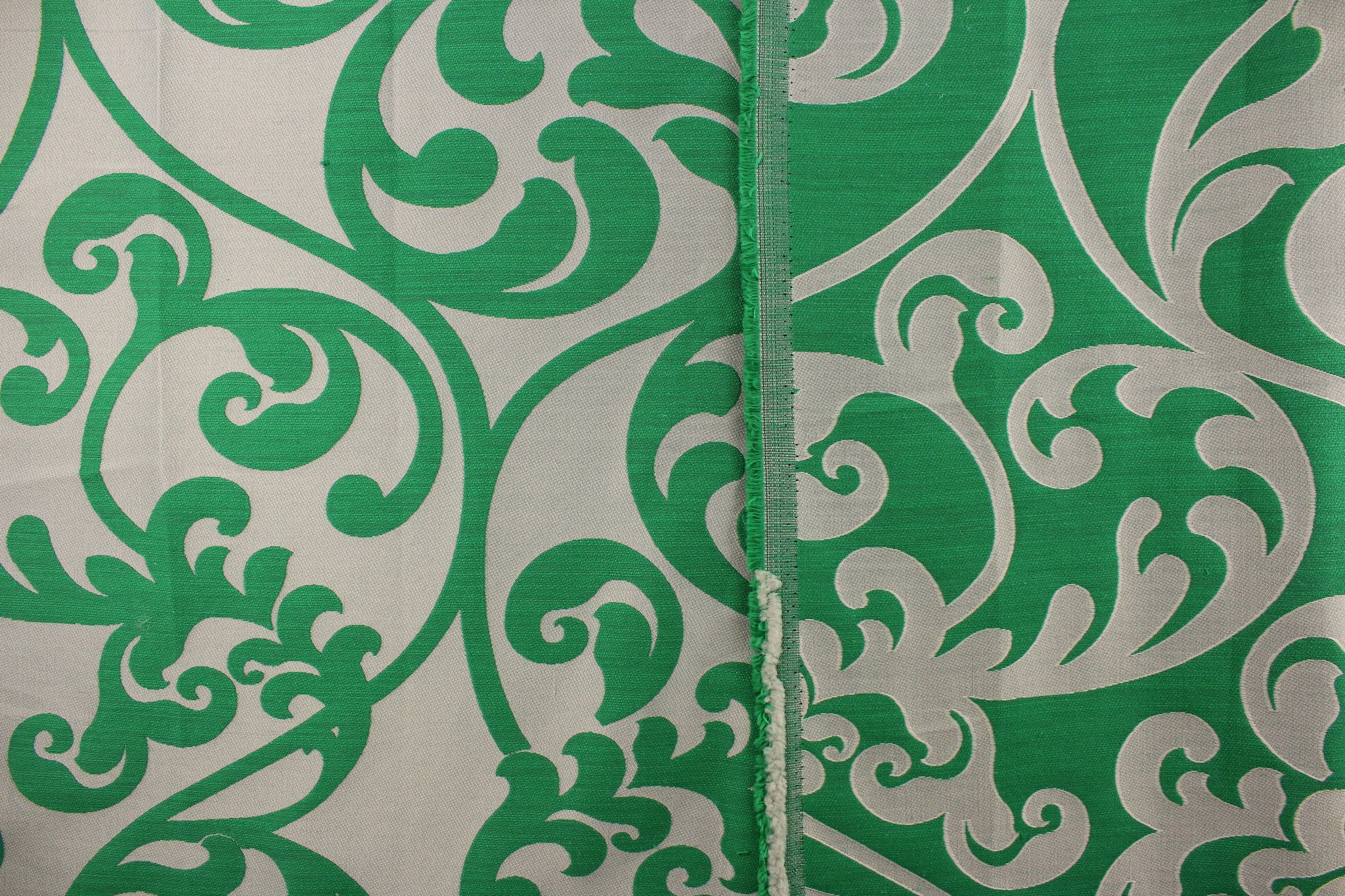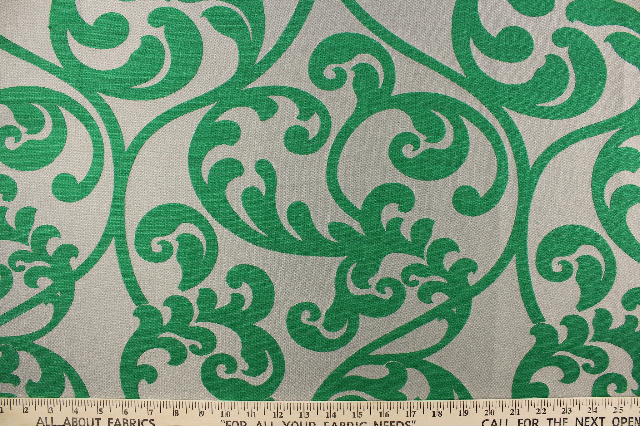 DESCRIPTION: This beautiful tapestry fabric features a scroll design on a solid background. It can be used for bedding, drapery and accent pillows. It would be a great accent in any room in your home. Colors included are green and gray.