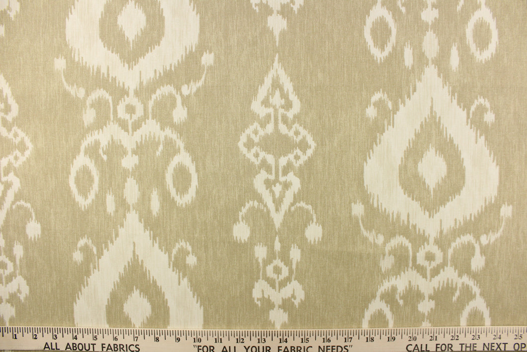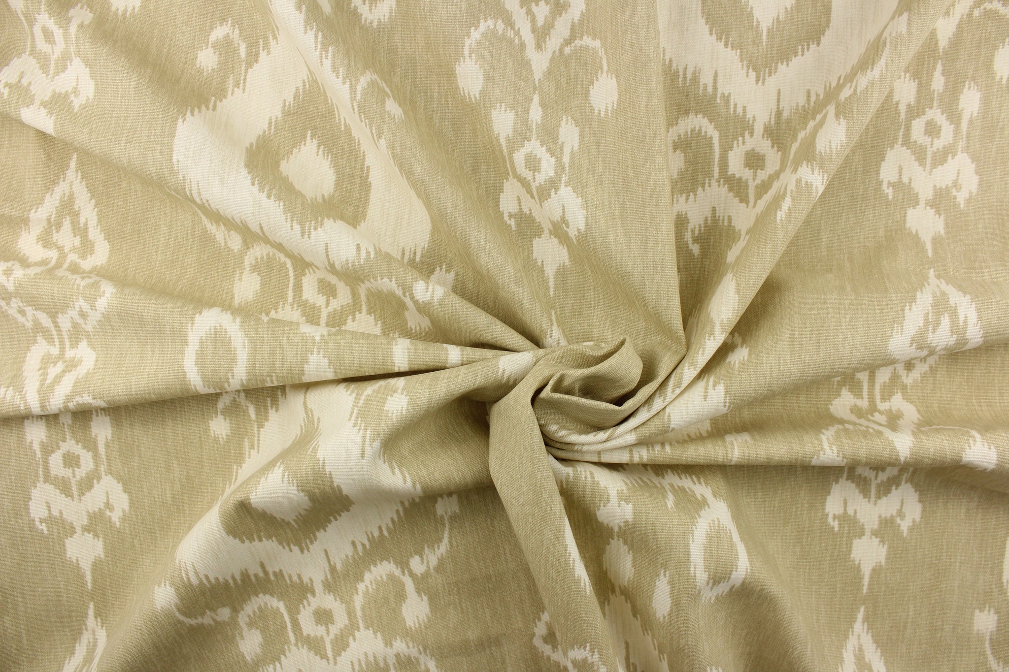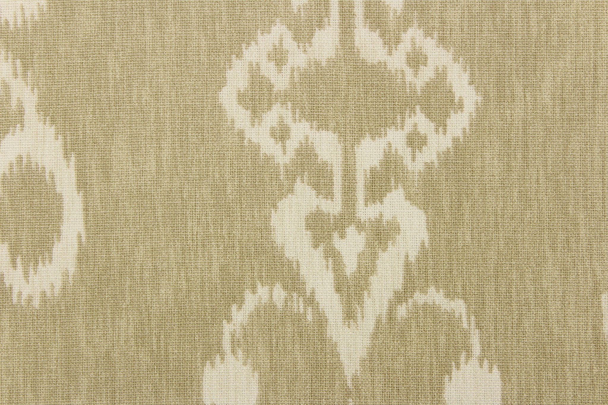 DESCRIPTION: This fabric features an ikat design in a khaki and off white. Use this for drapery, upholstery, pillows, home décor, etc. We offer this design in several different colors.