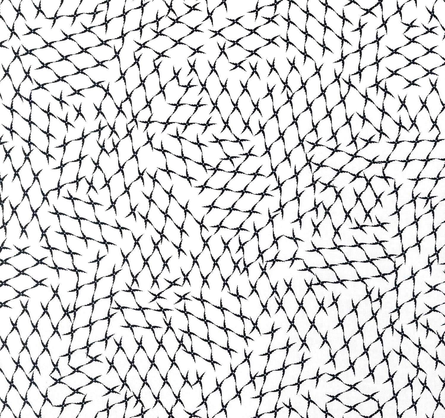 DESCRIPTION: Wander White from the Night Fancy Collection by designer Victoria Findlay Wolfe for Free Spirit Fabrics features a distressed or textured pattern of Black crosses or "x" shapes arranged in a somewhat grid-like, yet organic and slightly swirling, formation against a solid white background.
