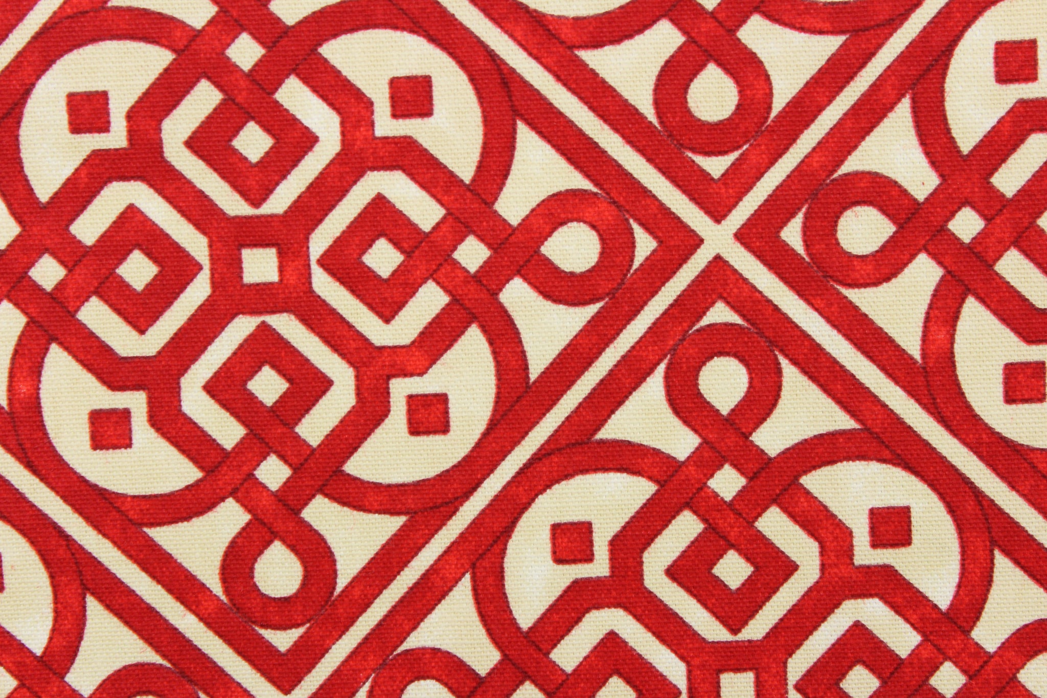 PATTERN DESCRIPTION:  This screen printed fabric features a charming lattice print design in red against an off white cotton club print cloth.  The versatile fabric is perfect for window accents (draperies, valances, curtains and swags) cornice boards, accent pillows, bedding, headboards, cushions, ottomans, slipcovers and upholstery.  It has a soft workable feel yet is stable and durable with a rating of 51,000 double rubs.