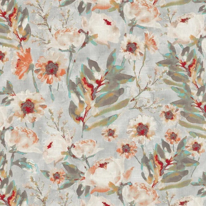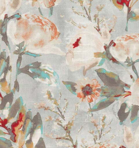 DESCRIPTION:  Spruce up your decor with Flower Mania in Shell. Designed with a vibrant floral pattern, this stunning floral fabric brings timeless elegance to any space. The color registration shows the colors peach, rust, teal, green, blue and red on a light grey background.