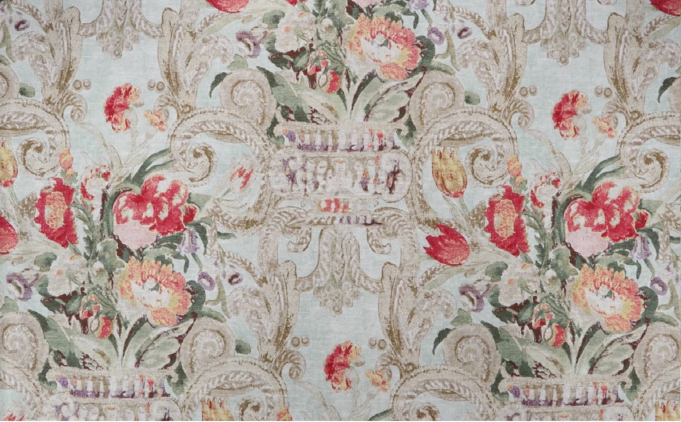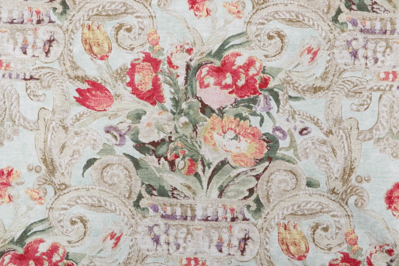 DESCRIPTION: The fabric depicts a beautiful Italian urn complete with flowers and curls, Villa Di Castello was scanned from the underside of the archival document to achieve a naturally imperfect quality. The faded colors complement the distress impression to create a unique antiquity. The color registration shows the colors coral, green, gold and peach on a seamist background.