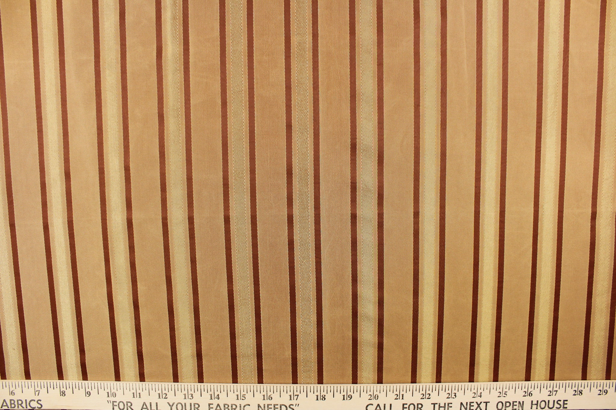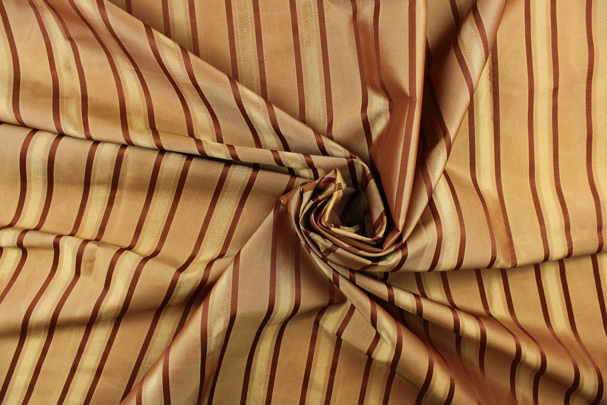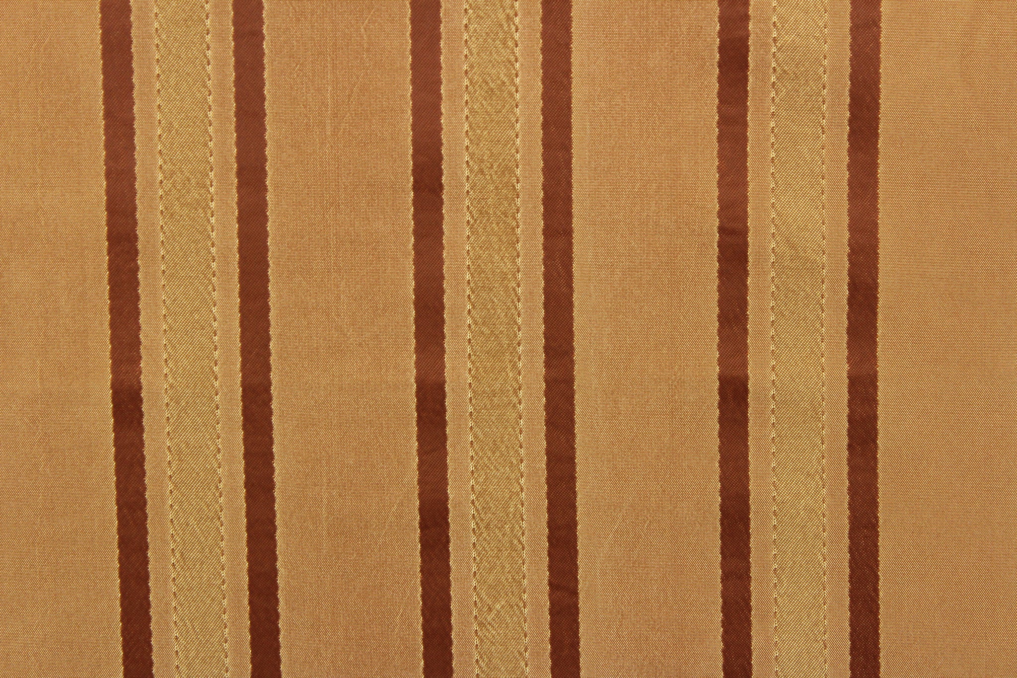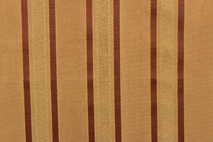 DESCRIPTION: This stunning yarn dyed fabric features a striped pattern in copper tones and gold. Enhancing the various colors of the stripes is a slight sheen. Light weight makes it versatile to work with but the 100% polyester fabric makes it durable, strong, and wrinkle resistant. This fabric would enrich any room whether you use it for drapery or an accent chair. It is also perfect for throw pillows, home décor, duvet covers and apparel. The possibilities are endless. We offer this Warwick striped pattern in a wide variety of colors